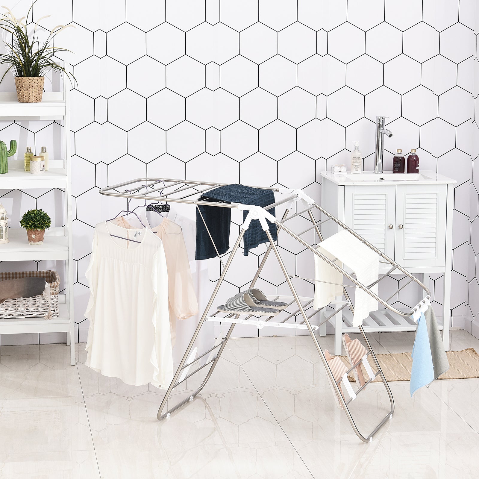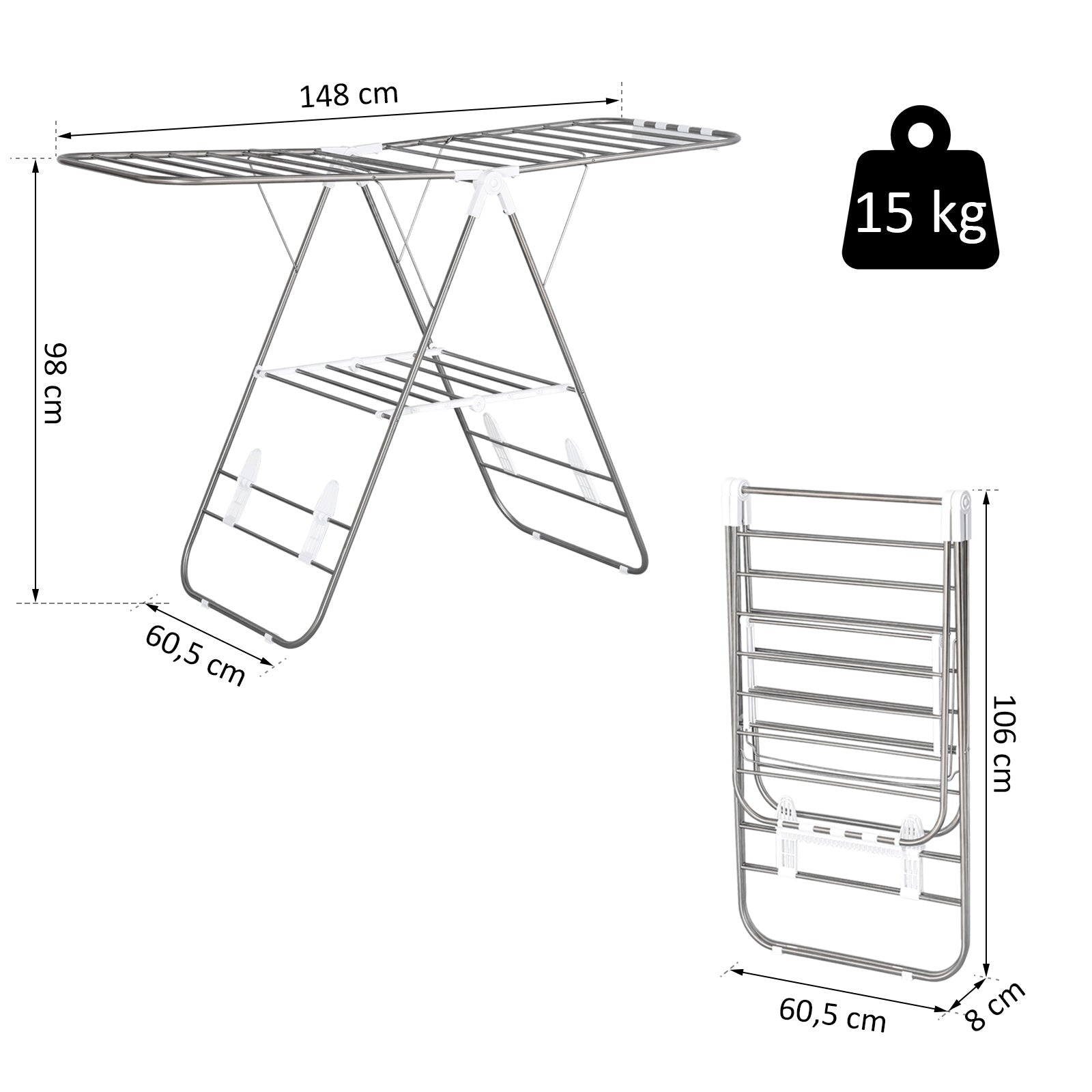 Dette tørrestativ giver dig rigeligt med plads til tørring af tøj og håndklæder. Det unikke design med to vinger og tværstænger sikrer optimal udnyttelse af pladsen. Lavet af rustfrit stål med skridsikre gummipuder i bunden, tilbyder det stabilitet og holdbarhed.
