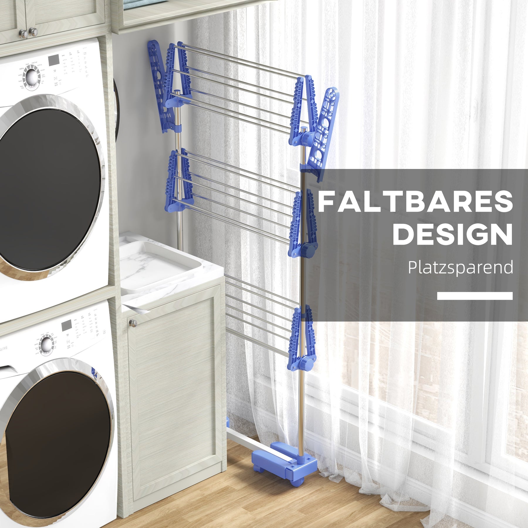 Tørrestativ. 4 niveauer, foldbar, et-klik-system, 142 cm x 55 cm x 152 cm, blå + sølv