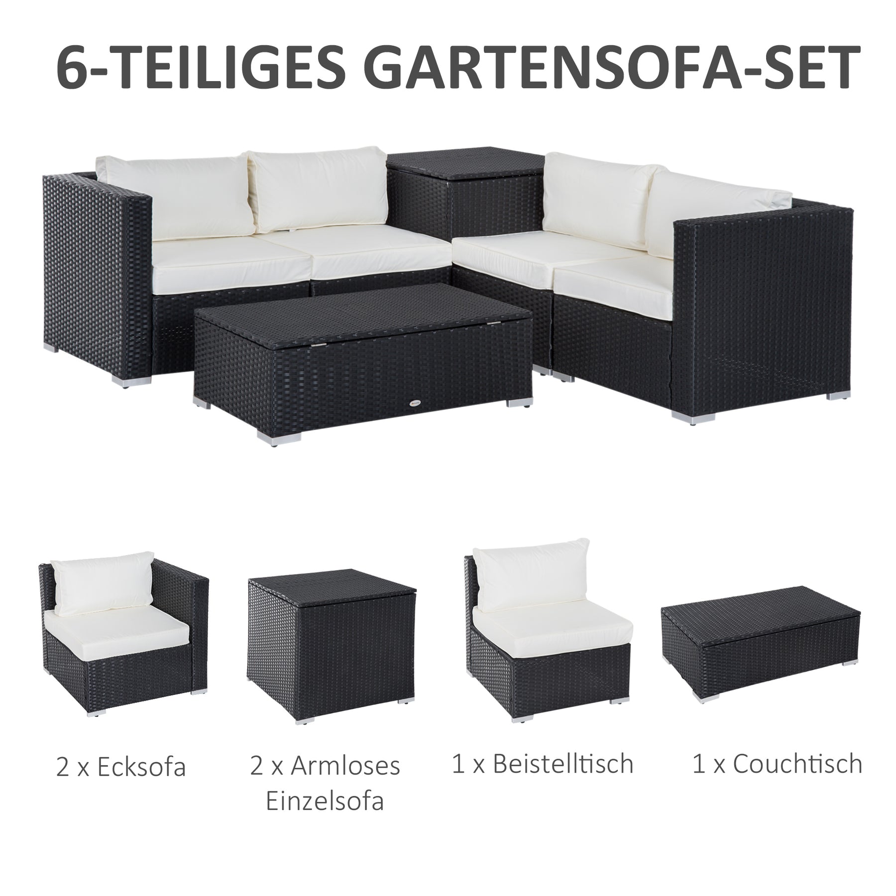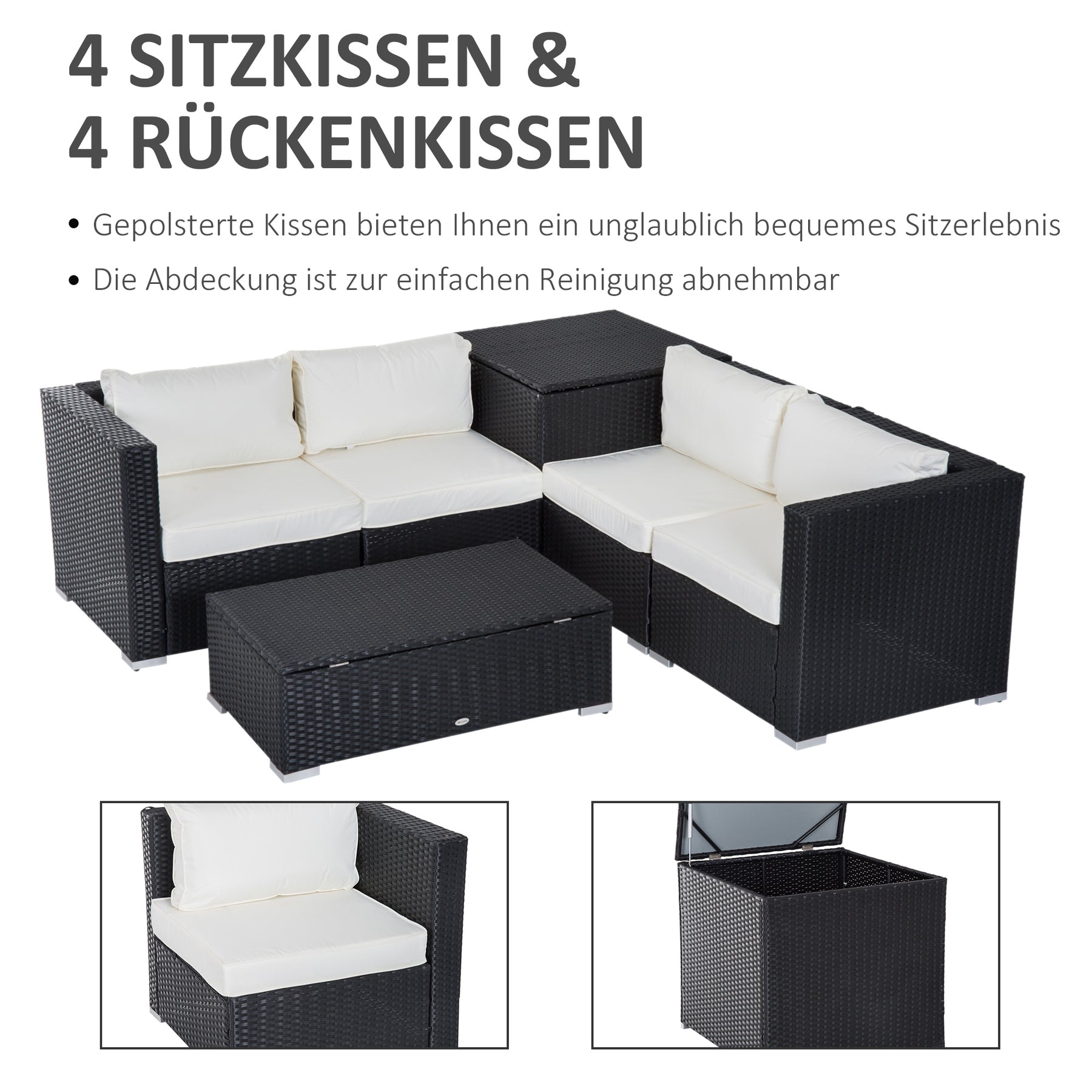 Dette havemøbel sæt i polyrattan er en fantastisk tilføjelse til din have, terrasse eller veranda. Siddegruppen består af to hjørnelænestole, to armløse siddeelementer, en kubisk opbevaringsboks og et praktisk sidebord med opbevaringsplads, som kan kombineres på mange forskellige måder. Det moderne, enkle design harmonerer perfekt med en bred vifte af indretningsstile og garanterer dig mange hyggelige og afslappende eftermiddage.