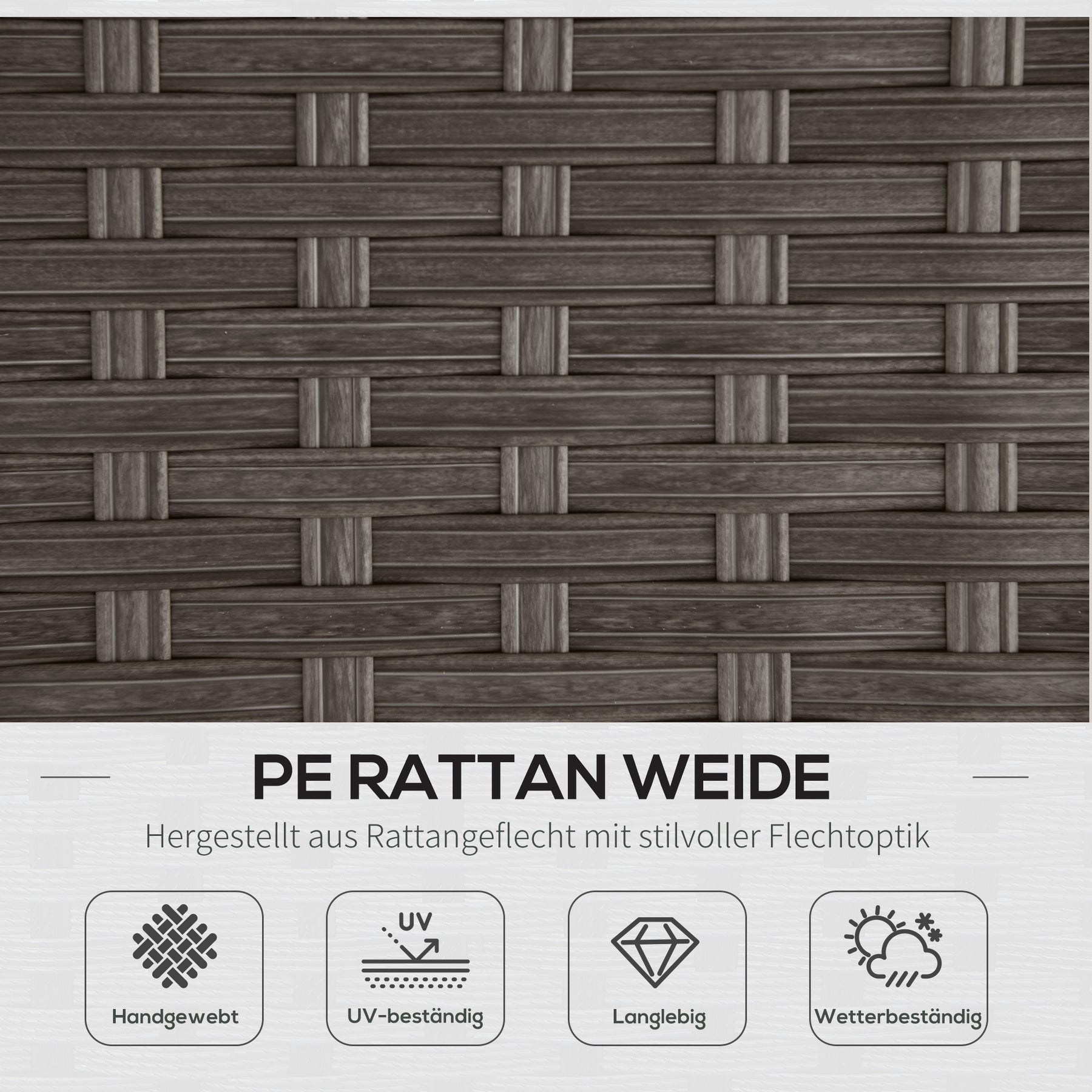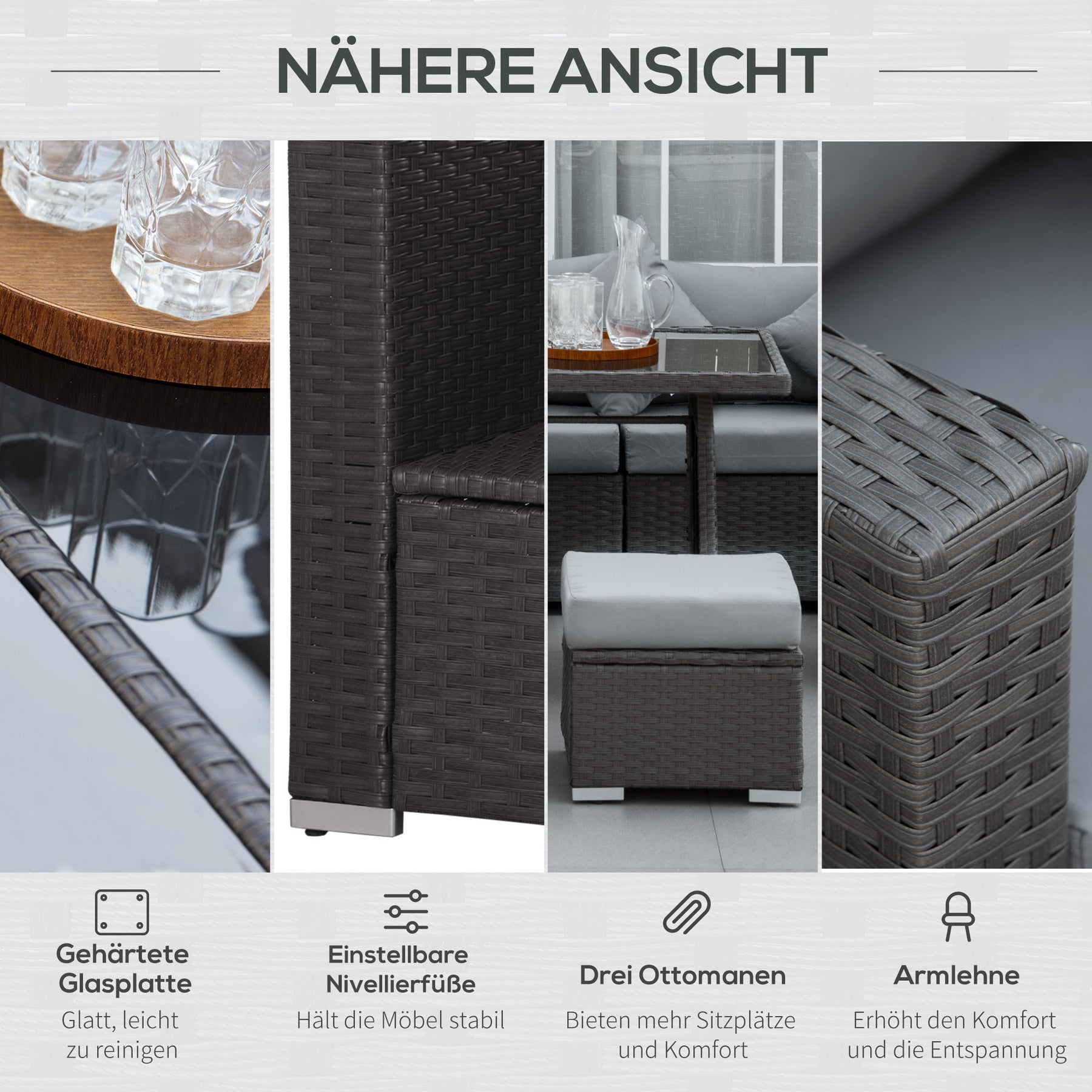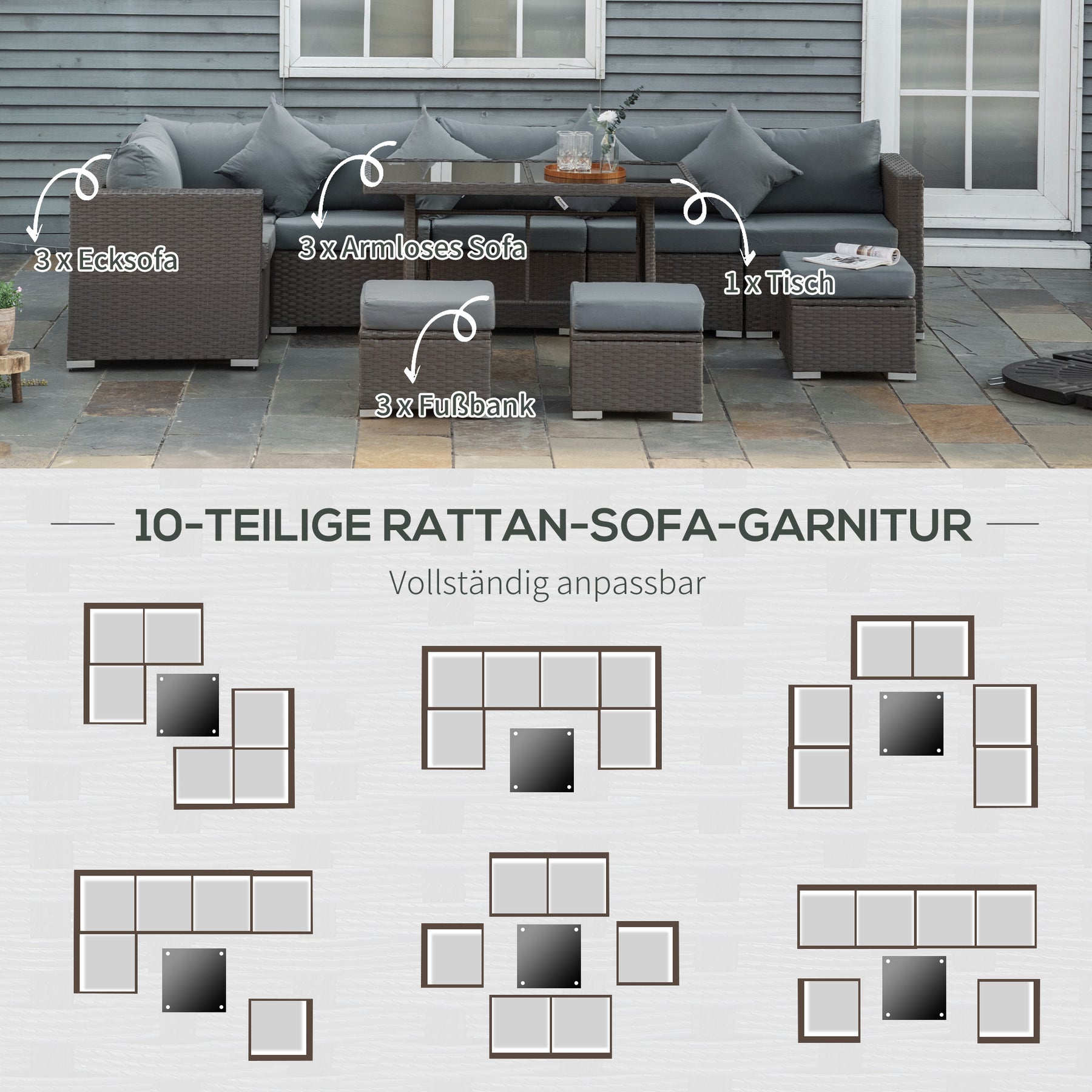Havesæt med 10 dele i rattan-look med sæde- og ryghynder, rustfri metalramme, mørkegrå