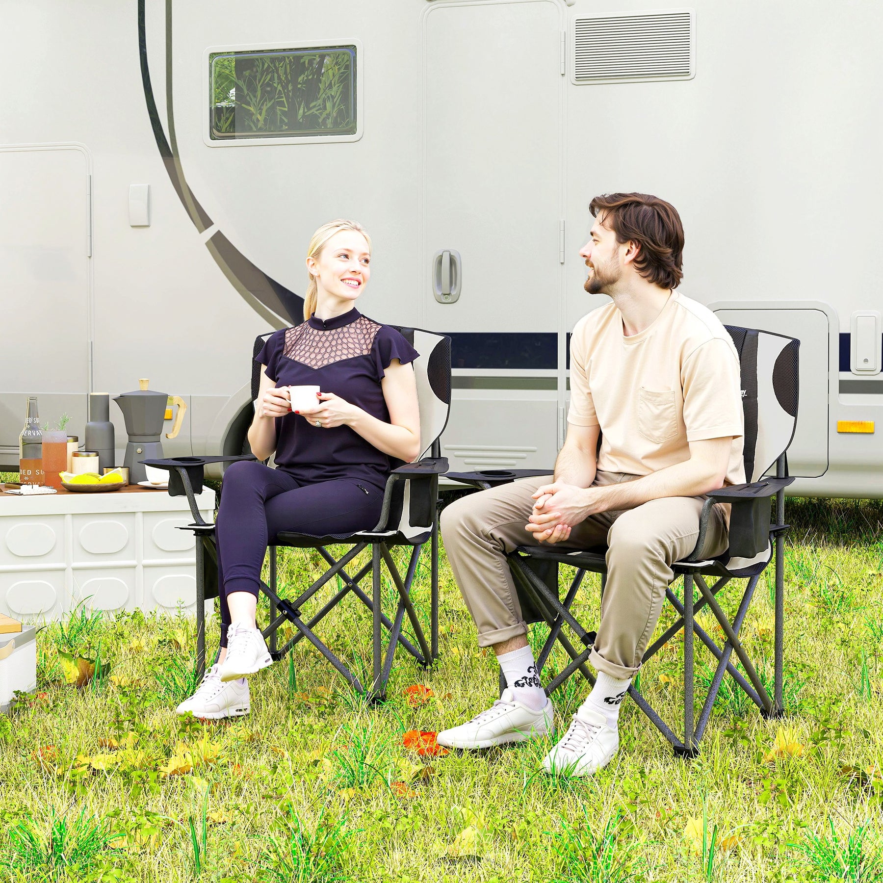 Oplev komforten med foldbare campingstole, der forvandler ethvert udendørs siddeområde til et hyggeligt tilflugtssted. Nyd en støttende nakkestøtte og rigelig polstring, fremstillet med en robust metalramme og stænk-sikkert stof. Udstyret med en kopholder og køletaske, er disse stole ideelle til afslappende timer udendørs.