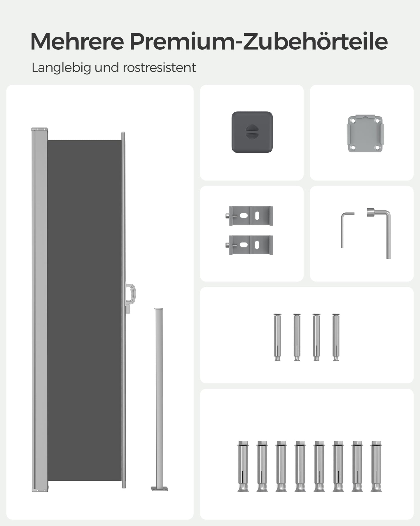 Markisen er bygget til at holde. Boksen og stolpen er lavet af stål af høj kvalitet, og skruerne i zink-nikkel-legering er rustbestandige og slidstærke. Den er let at spænde ud og kan rulles ind igen uden irriterende lyde, takket være en kvalitetsfjeder.