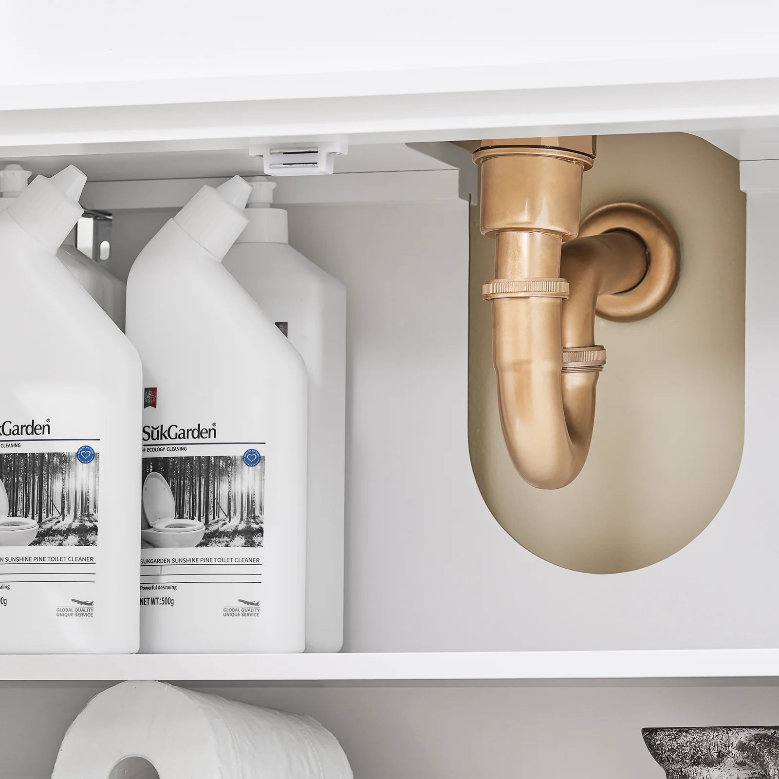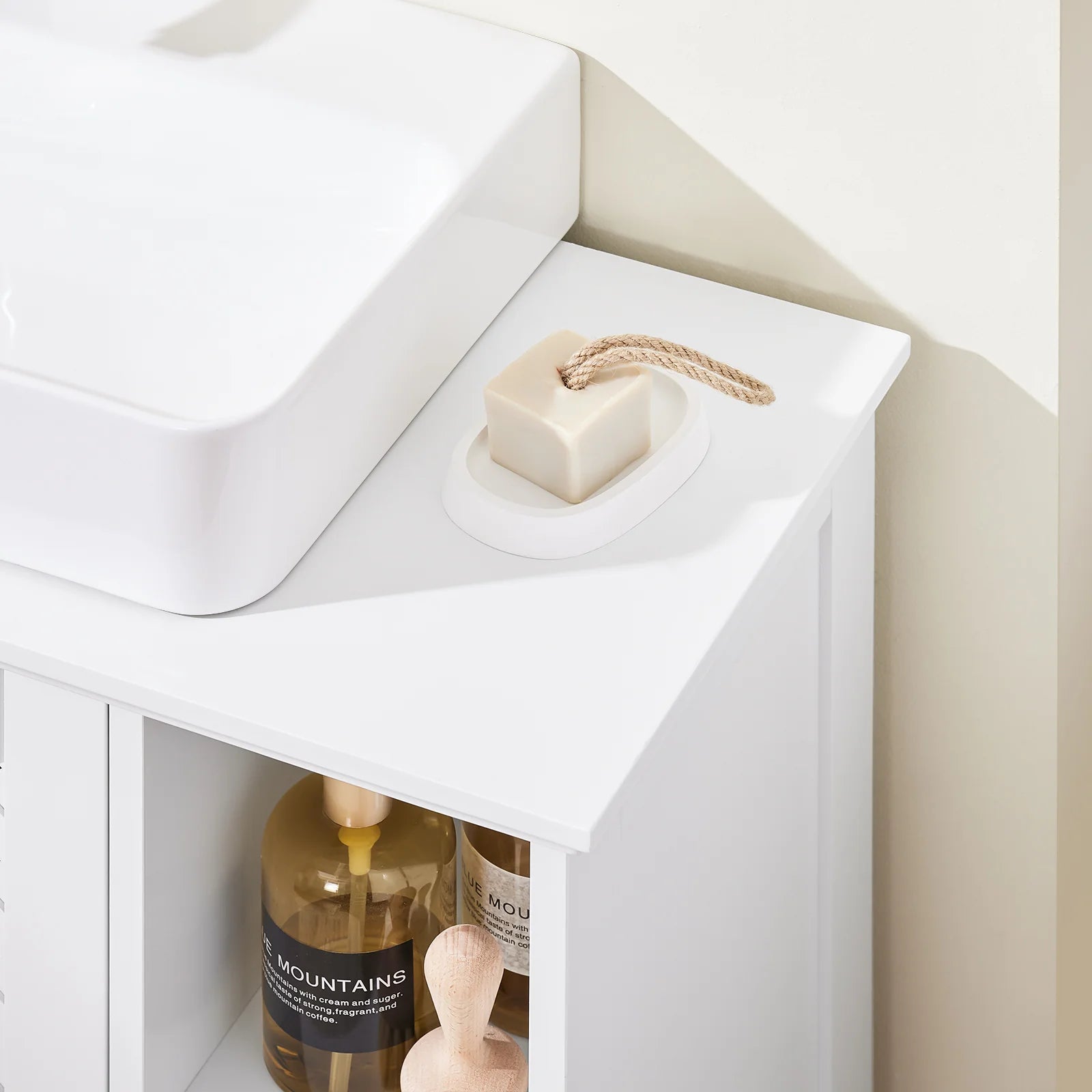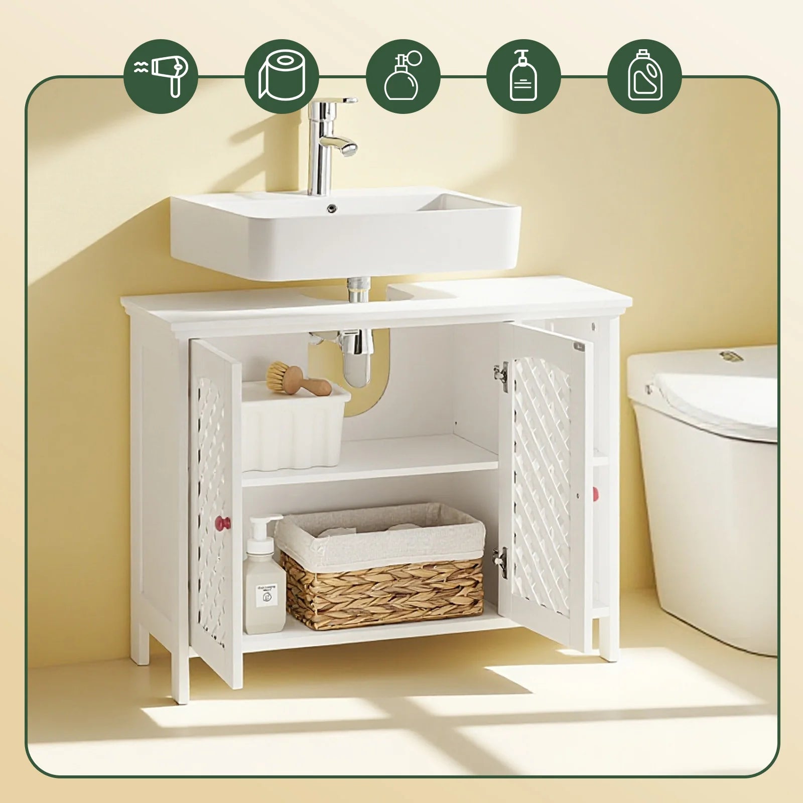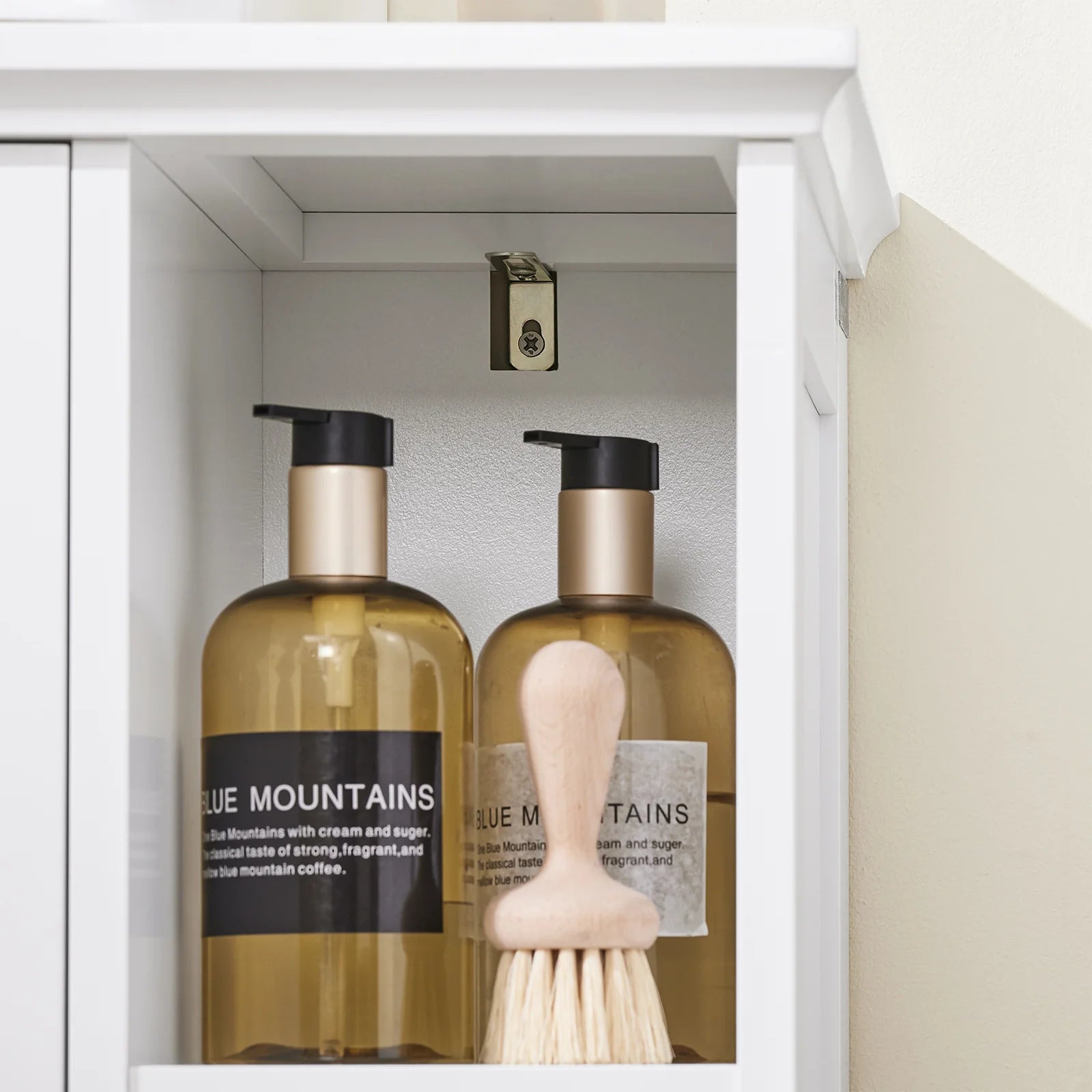 Med to døre og et åbent hyldefag skaber dette underskab masser af ekstra plads til håndklæder, rengøringsmidler, plejeprodukter og badeværelsesudstyr. Det er ideelt for familier, der ønsker at udnytte pladsen optimalt og holde badeværelset ryddeligt.