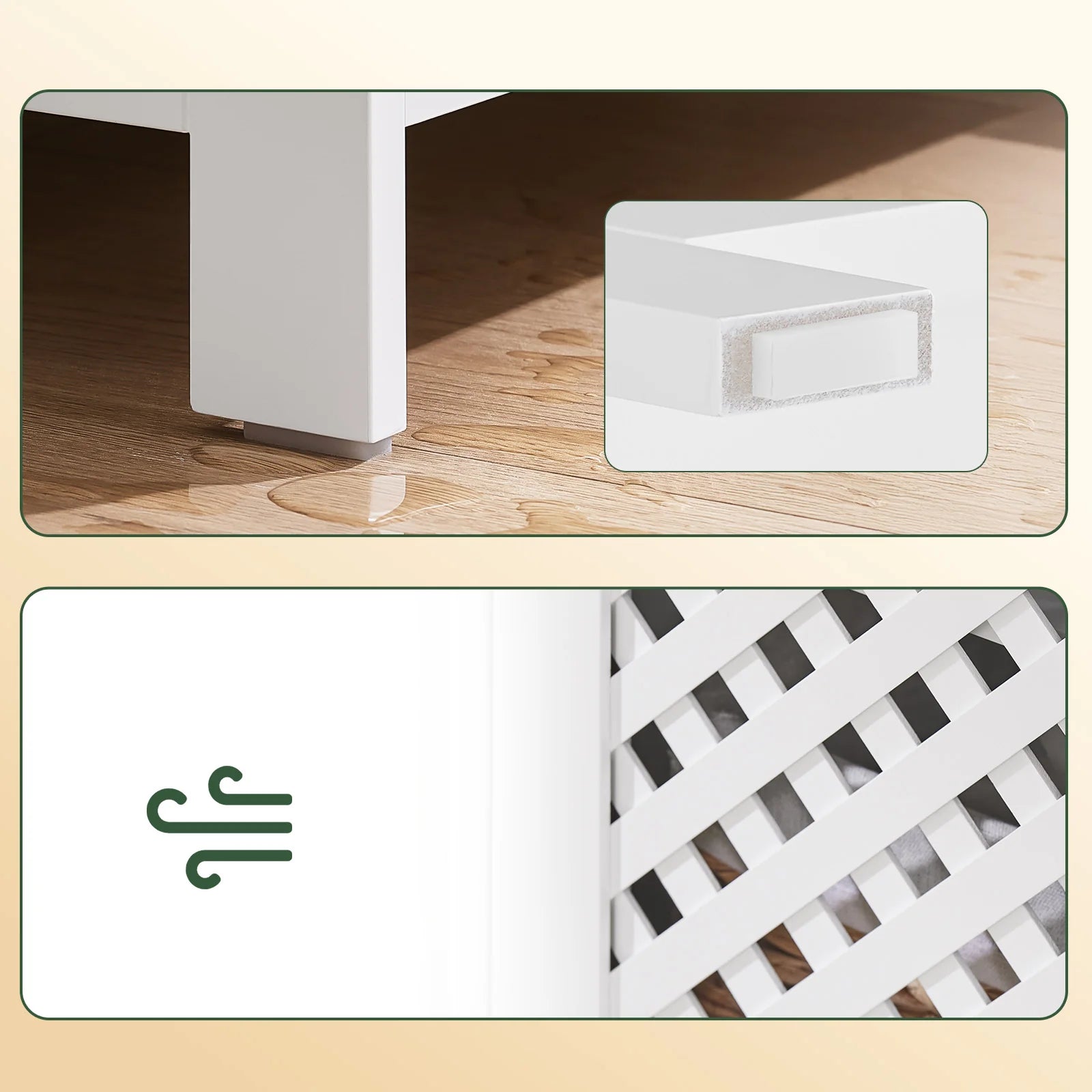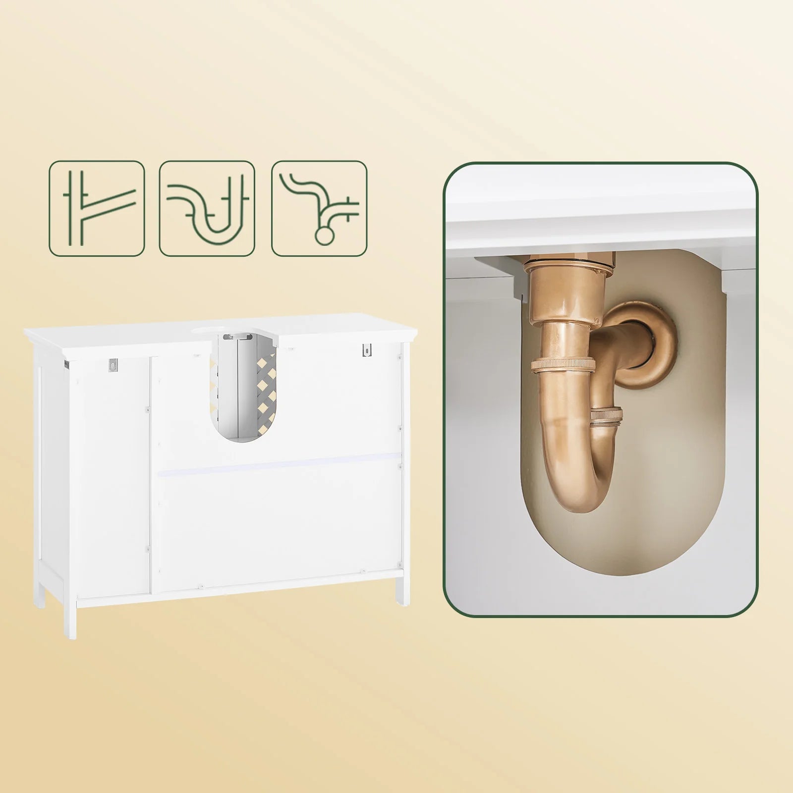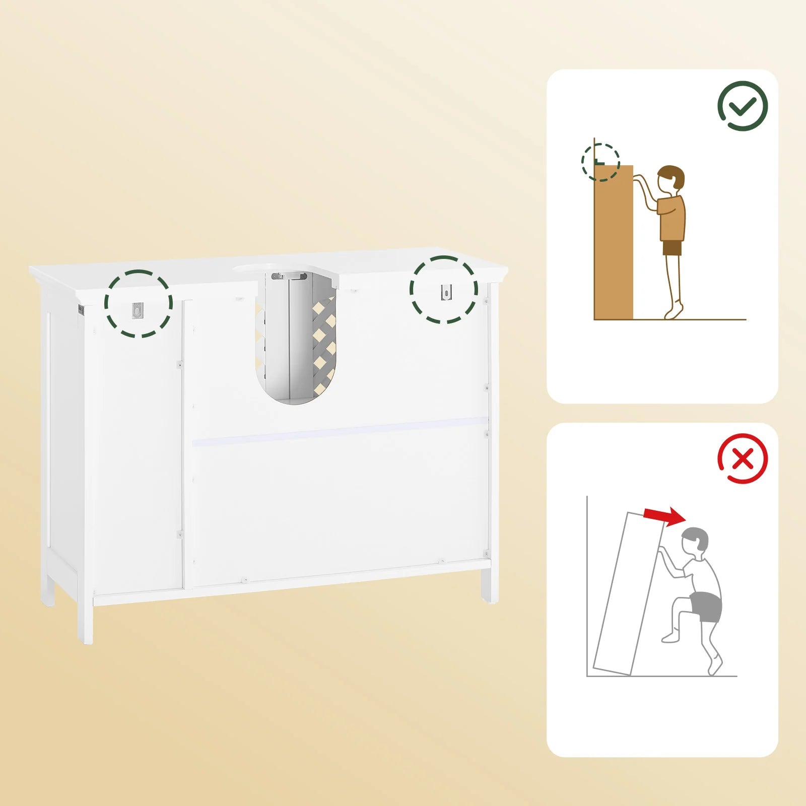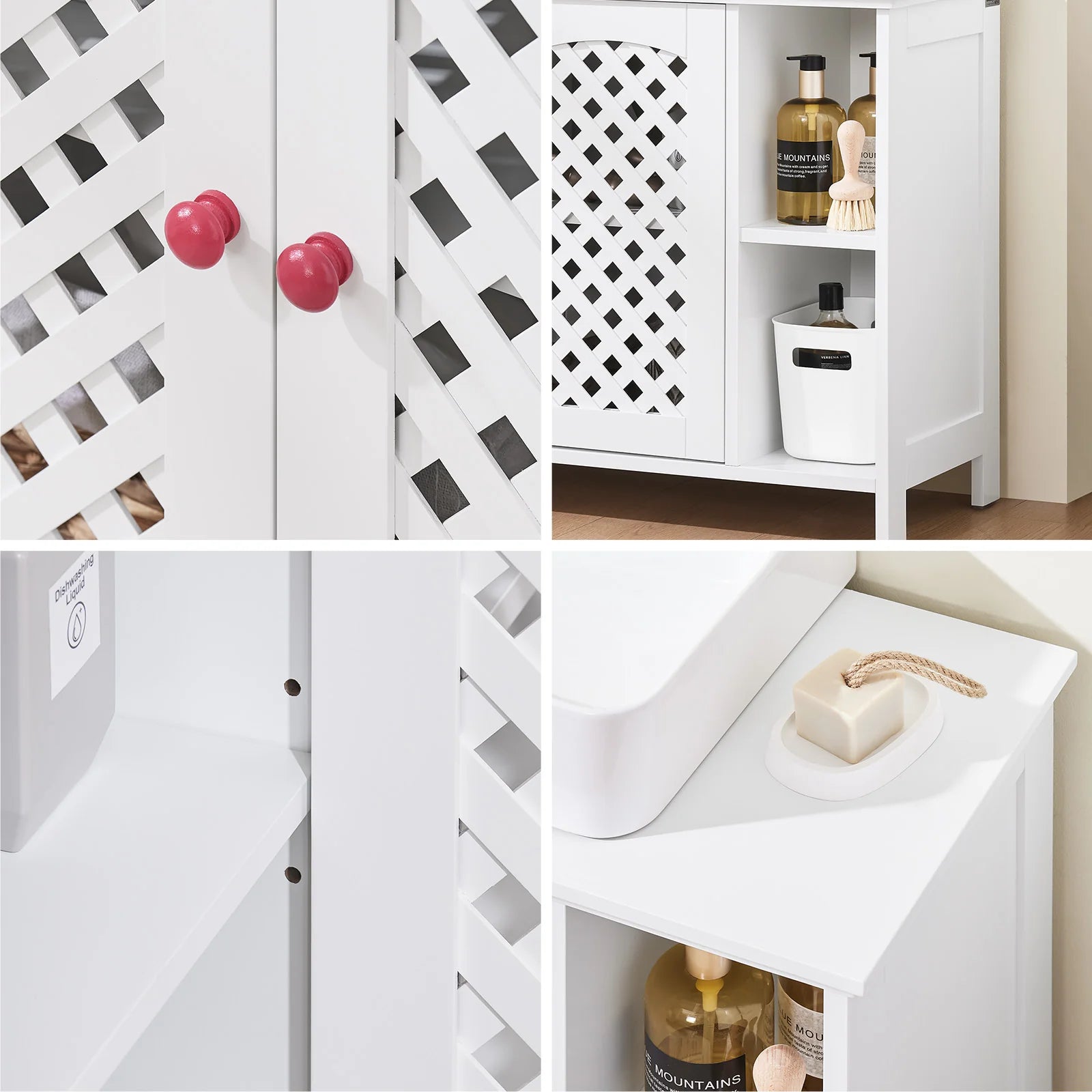 Med to døre og et åbent hyldefag skaber dette underskab masser af ekstra plads til håndklæder, rengøringsmidler, plejeprodukter og badeværelsesudstyr. Det er ideelt for familier, der ønsker at udnytte pladsen optimalt og holde badeværelset ryddeligt.