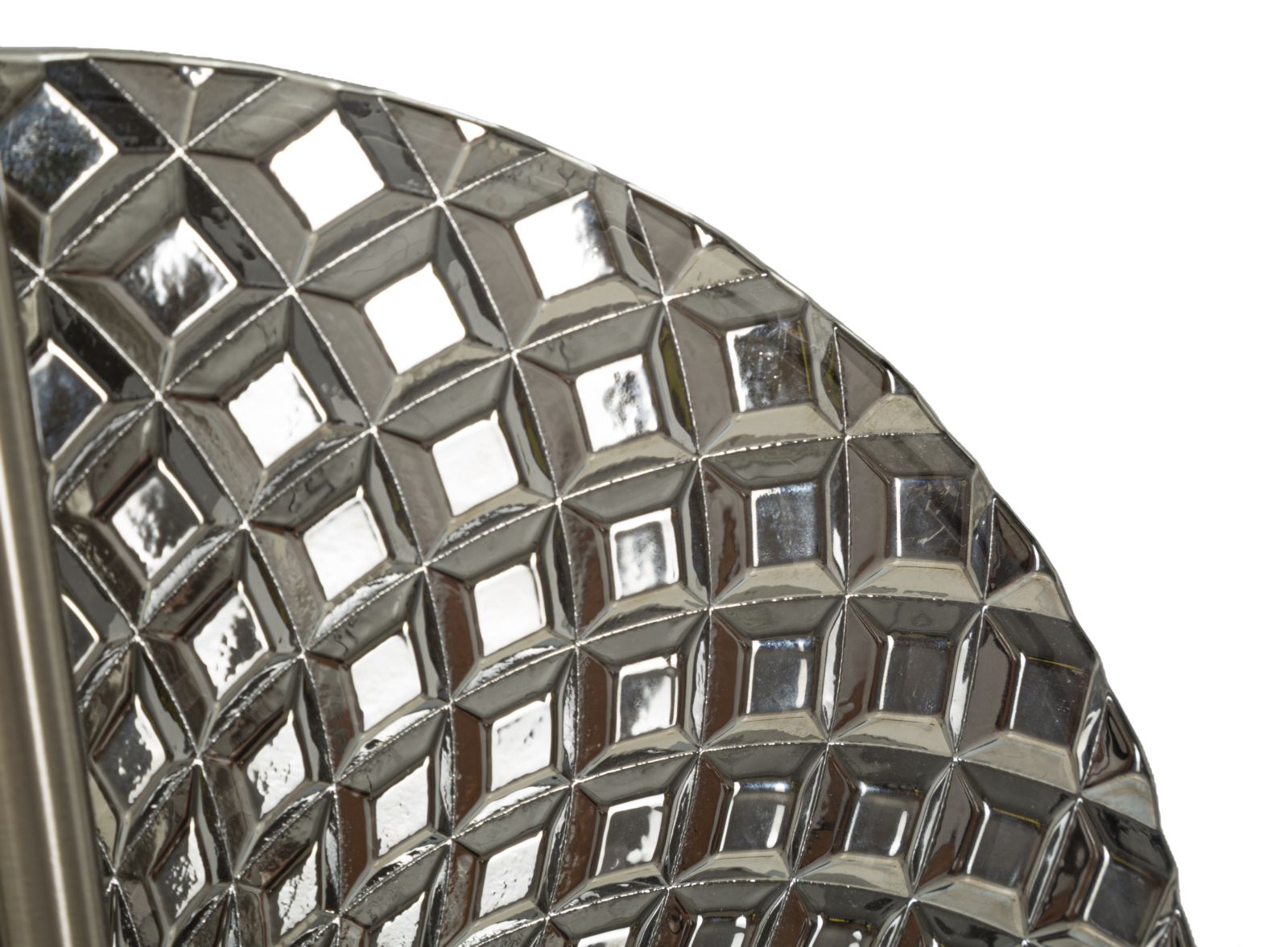 Med sin cirkulære form og to lyspunkter i sølvfarvet metal er denne lampe et stilfuldt og iøjnefaldende element. De elegante dekorative elementer i relief giver et unikt og eksklusivt udtryk, der passer perfekt til en elegant indretning.