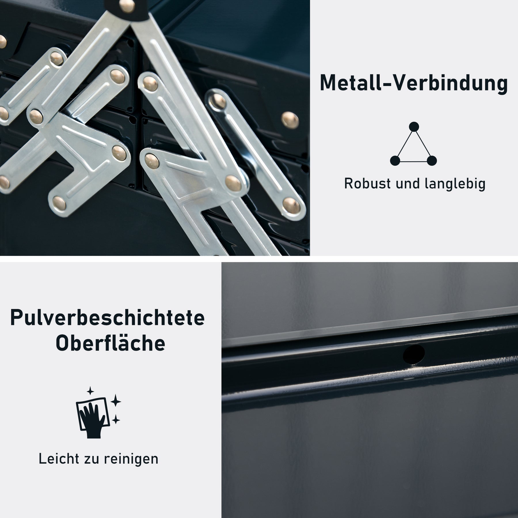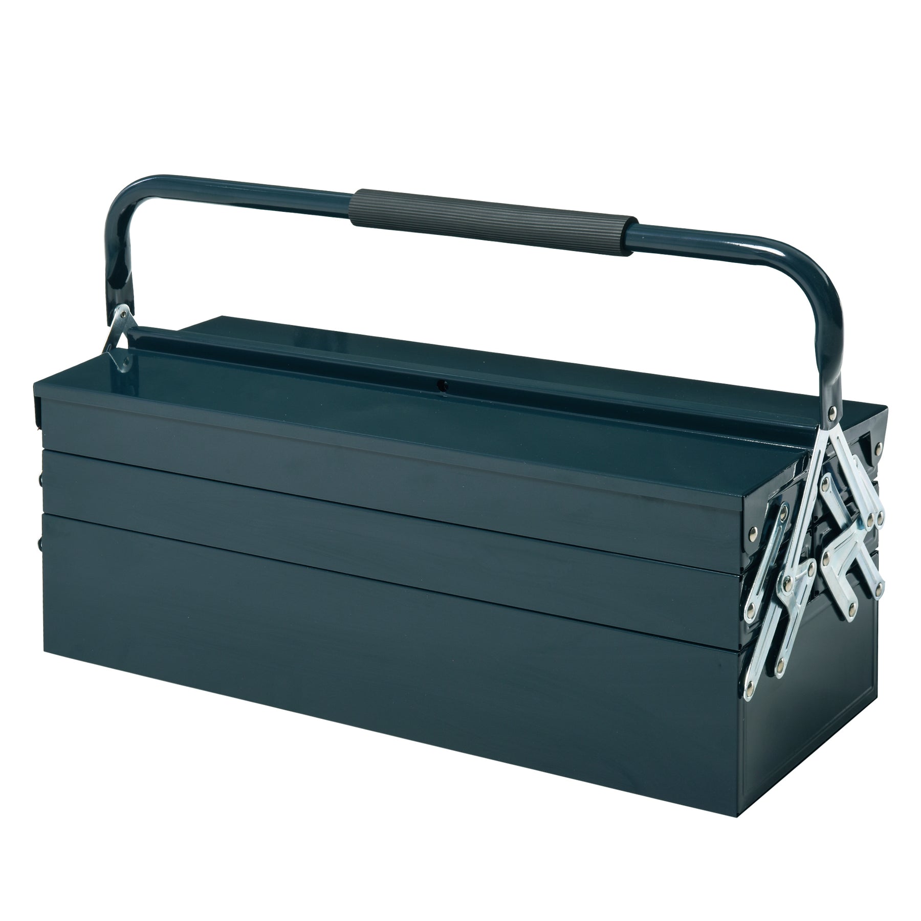 Med denne værktøjskasse har du altid dine værktøjer lige ved hånden. Tre niveauer og fem rum giver masser af plads til værktøj og tilbehør. Den er lavet af stål af høj kvalitet, der er rustfri og ridsefast, og dens bære håndtag gør den nem at transportere.