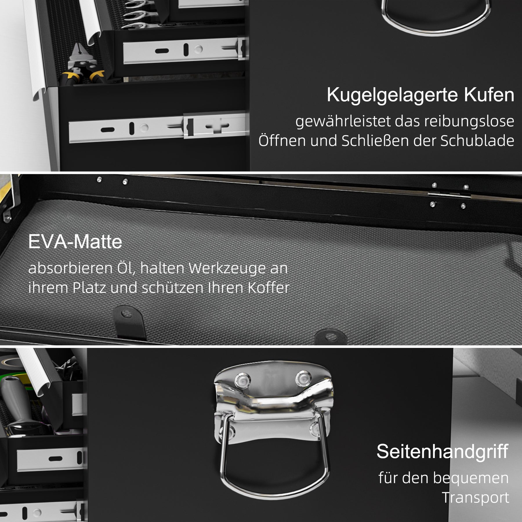 Sidehåndtagene sikrer, at du nemt kan flytte kassen, og de låsbare opbevaringsområder holder værktøjet sikkert. Ingen samling er nødvendig, så du kan komme i gang med det samme.