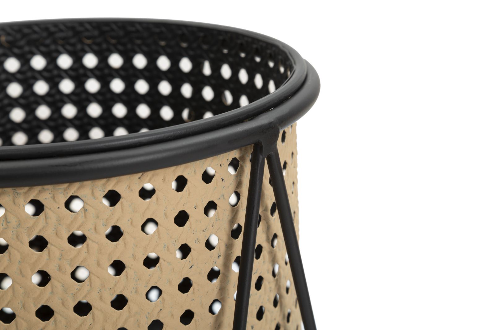 Sættet består af to runde vaseholdere i cremefarvet metal med udskæringer, der minder om det populære fletværk fra wienerflet. Hver holder står på en elegant sort metalfod, der skaber en flot kontrast. Den øverste del, der holder potten, er aftagelig, hvilket giver praktisk fleksibilitet.