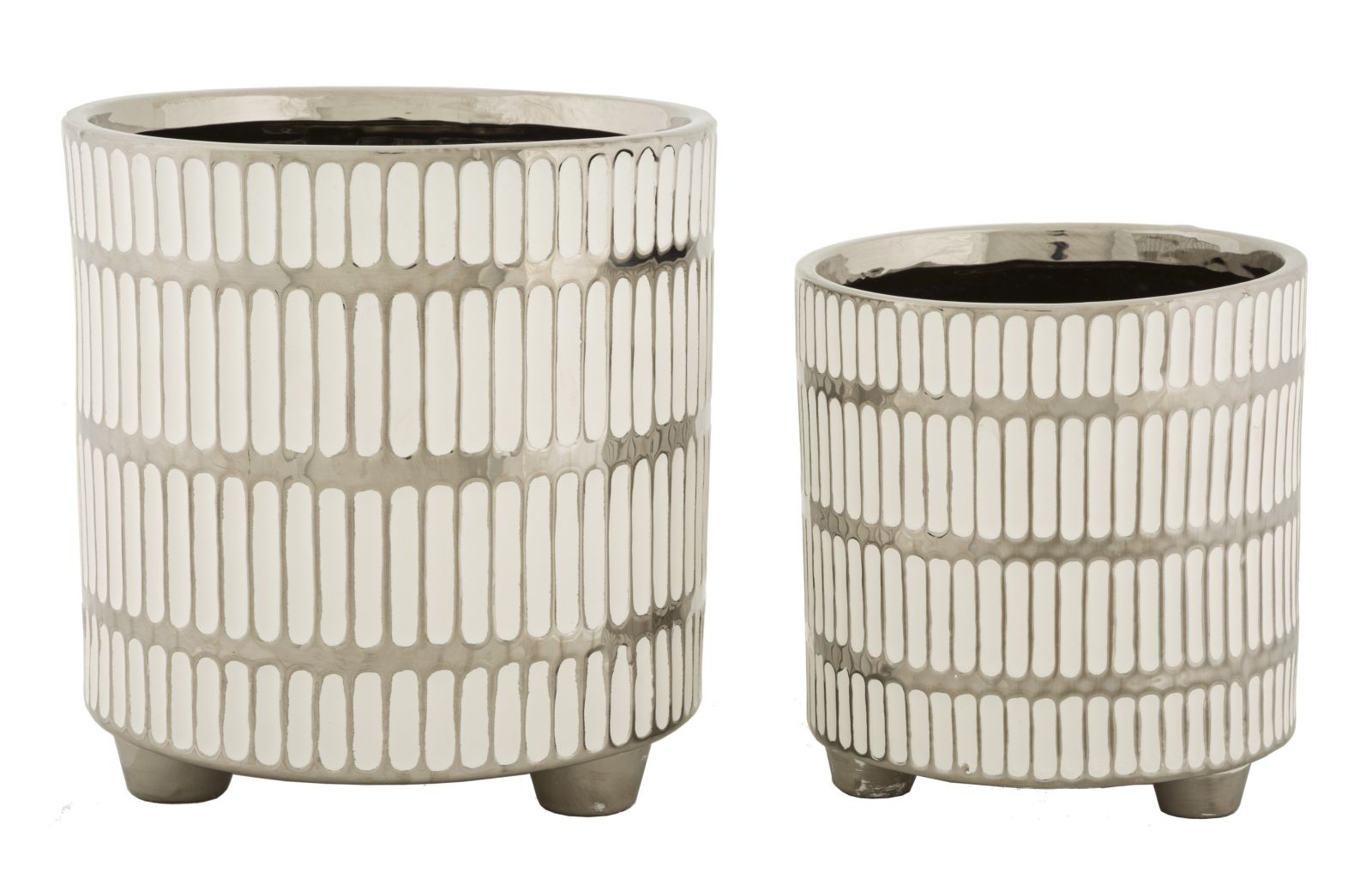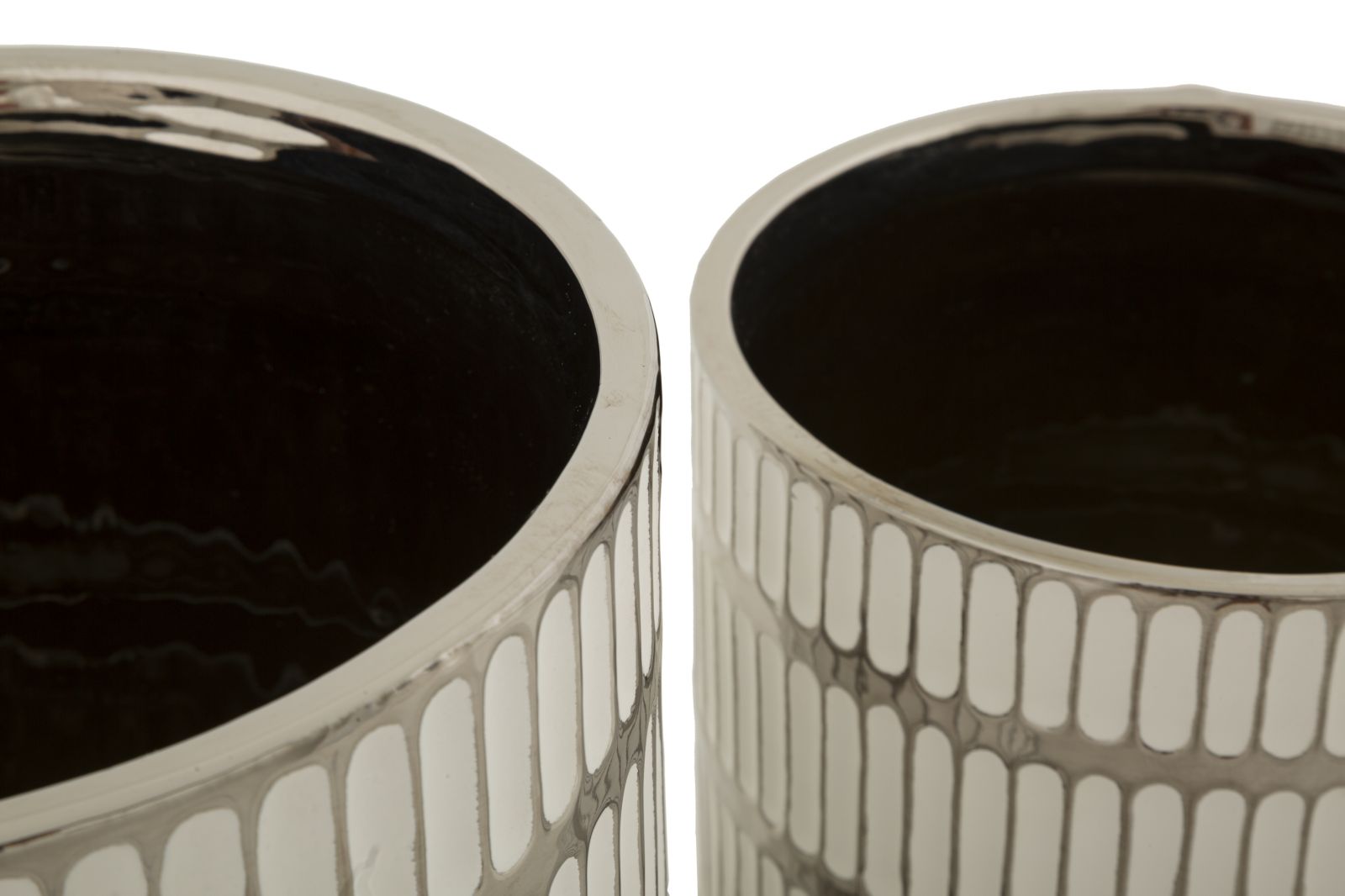 Vasernes unikke, hvide overflade er smukt dekoreret med elegante dekorationer i sølvrelief, som skaber et iøjnefaldende og eksklusivt udtryk. Denne kombination af farver og teksturer tilfører et sofistikeret touch til enhver indretning.