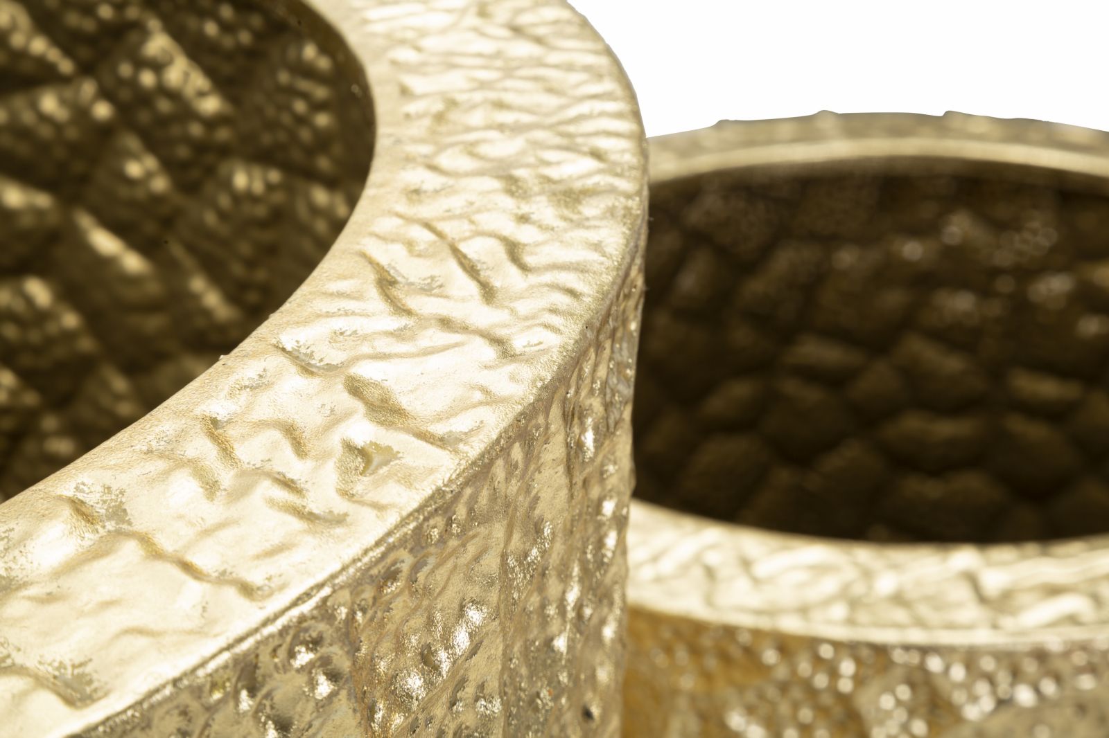 Sættet består af tre runde vaser i gyldent metal med elegante, uregelmæssige relief-dekorationer. Den smukke gyldne farve giver et stilfuldt og eksklusivt udtryk, der passer perfekt til en elegant indretning.