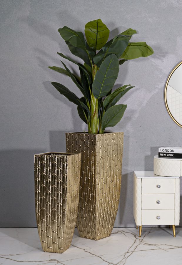 Dette elegante sæt af to vaser fra Glam-serien er en perfekt kombination af funktion og stilfuldt design. Vaserne er fremstillet af robust guldfarvet jern og udstråler kvalitet og godt håndværk.