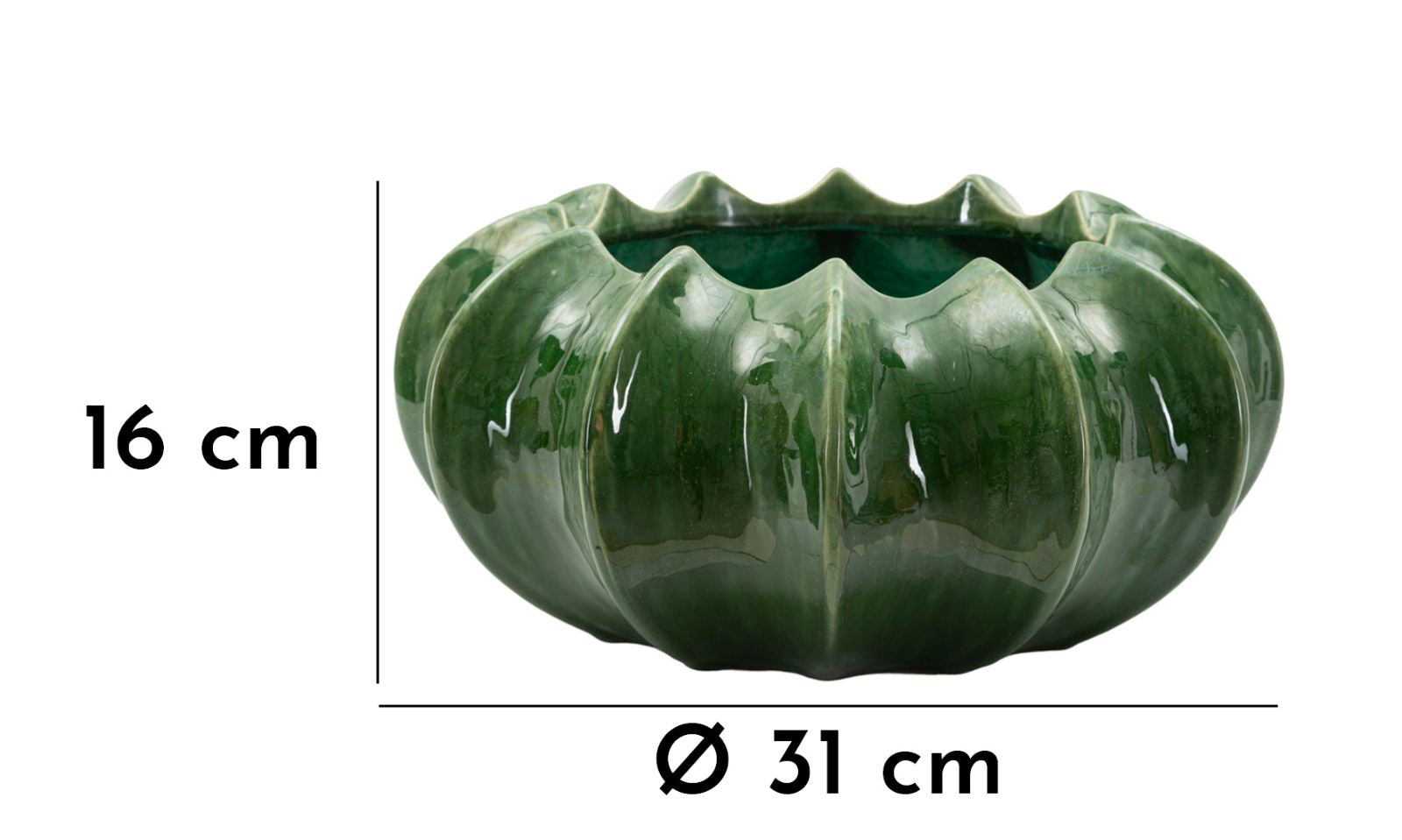 Denne cachepot, med sin bløde og originale form, er inspireret af kaktusverdenen. Den blanke finish og intense grønne farve gør den ideel til at dekorere med en naturlig og moderne stil i ethvert rum. Placer dette produkt i din stue, entré eller på kontoret, og lad det fungere som et iøjnefaldende element, der skaber et unikt fokuspunkt.