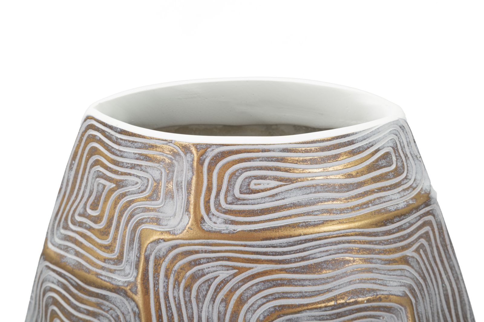 Vasen er elegant dekoreret med geometriske former, der har bløde og afrundede linjer, hvilket skaber et unikt og iøjnefaldende design.