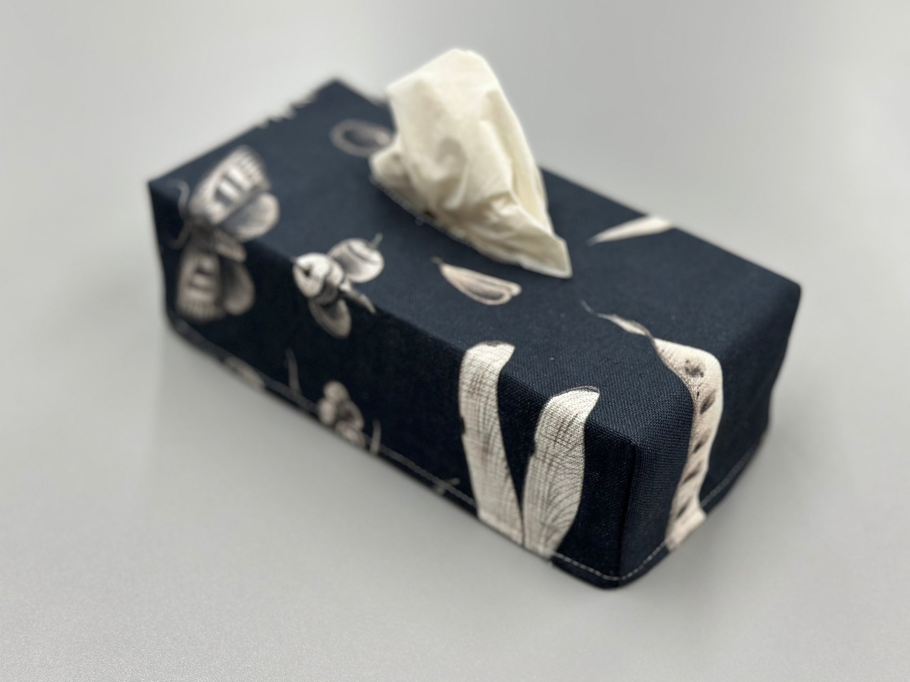Bring naturens skønhed ind i dit hjem med vores charmerende tekstiler. Vores servietboks-betræk i 100% bomuld har en elegant sort baggrund med et delikat print af guldsmede og artiskokker. Det er den perfekte måde at tilføje et sofistikeret og overraskende element til ethvert rum og imponere dine gæster.