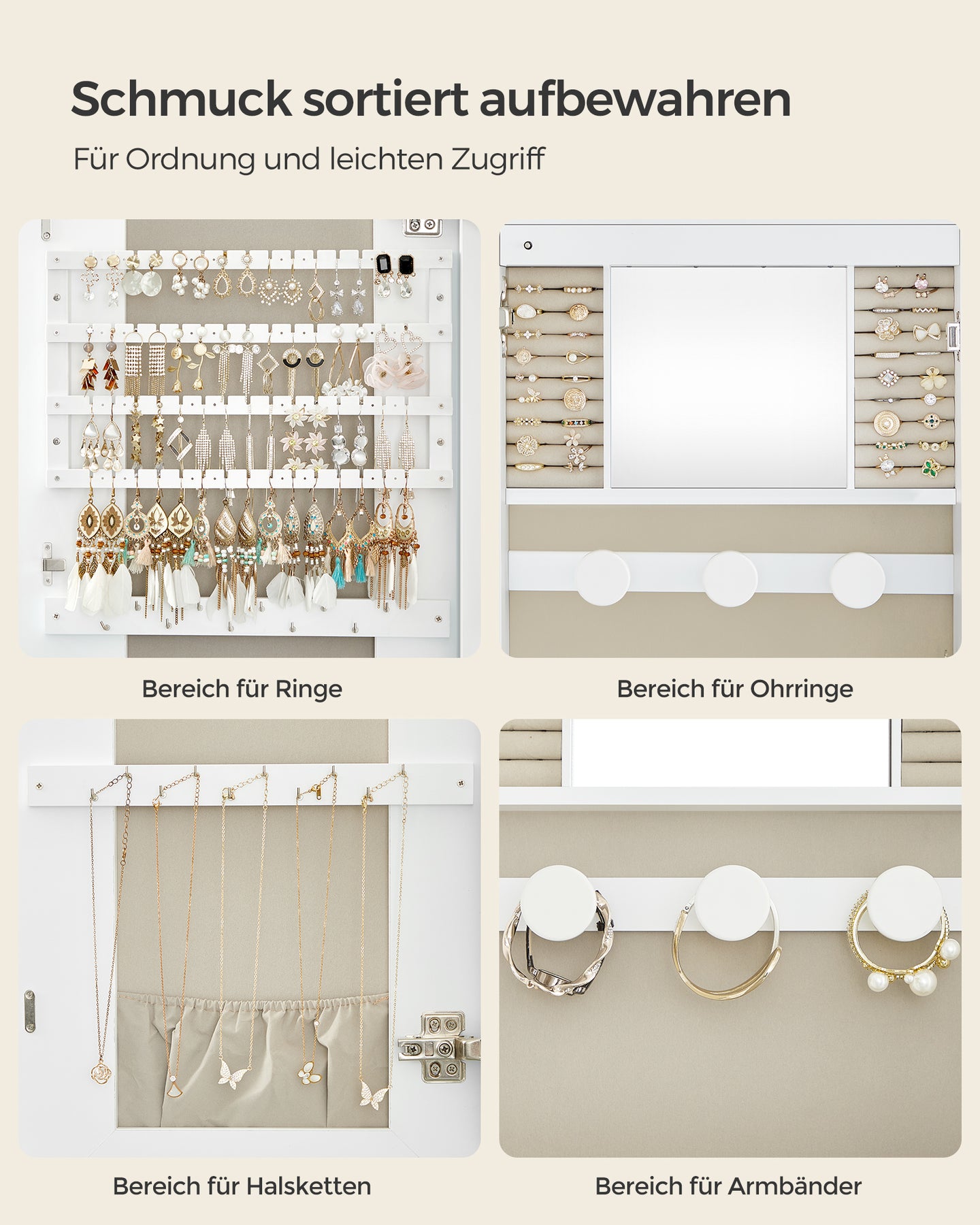 Gemt bag det elegante spejl finder du en praktisk opbevaringsløsning til dine smykker. Her er der masser af plads til at organisere øreringe, halskæder, ringe, armbånd og makeup. Sig farvel til rodet og den daglige kamp for at finde det, du skal bruge!