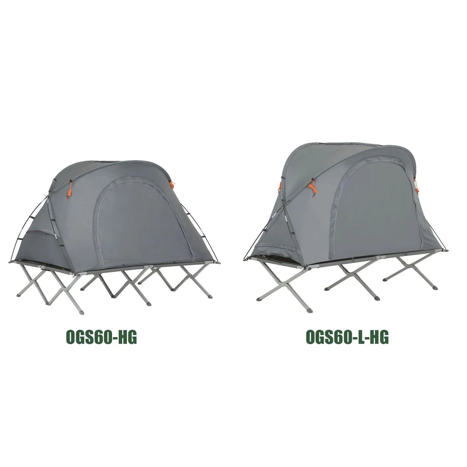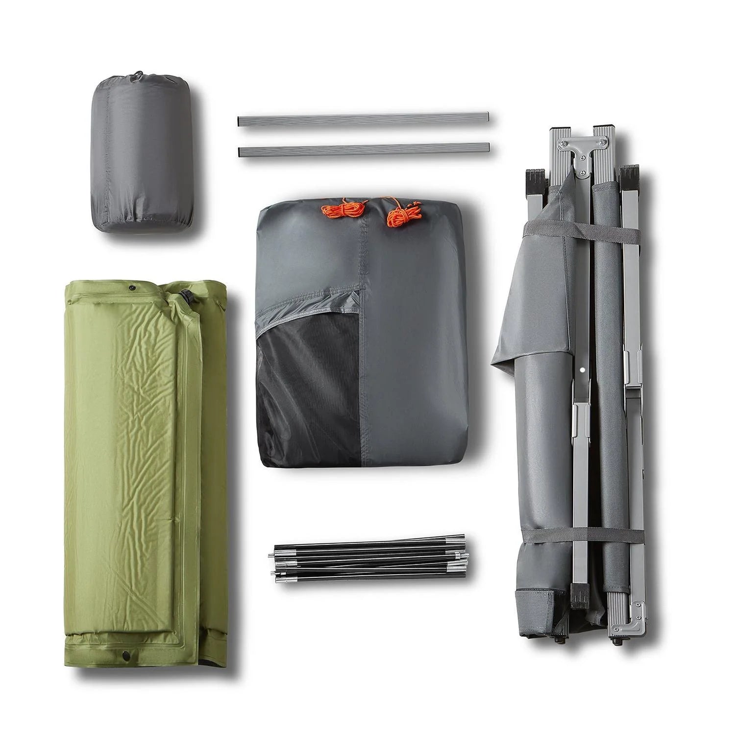 Teltet har en praktisk lynlås og den hævede hængekøje holder dig fri fra fugtig jord. Den oppustelige madras har bløde luftkamre, der hurtigt pumpes op, og de to ventilationsventiler på siderne sikrer god luftgennemstrømning for en behagelig søvn.