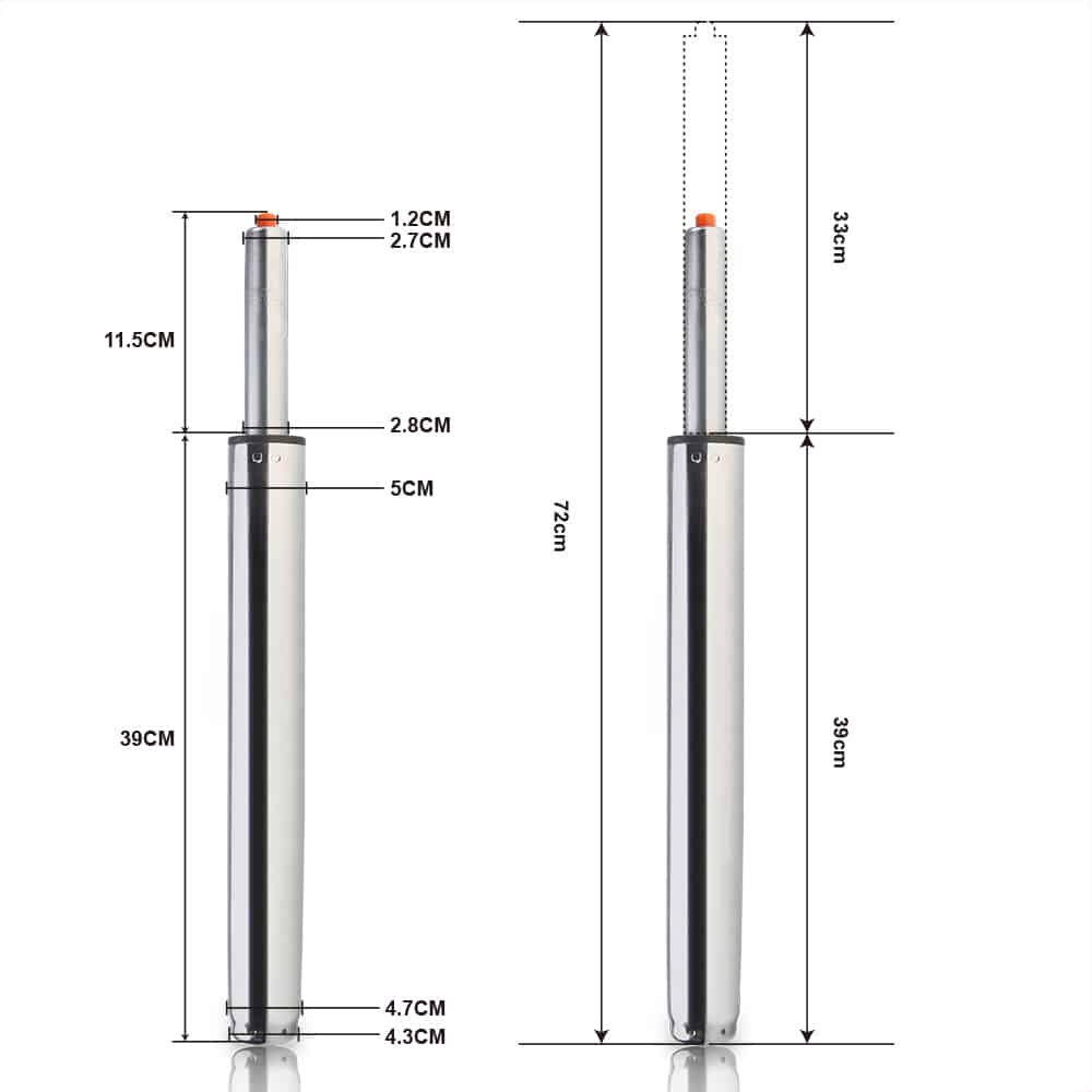 Cylinderen og det frit bevægelige stempel i den har en integreret dæmpningsmekanisme og muliggør således et blidt op- og nedløft . Takket være den koniske stikforbindelse kan gastrykfjederen bruges til næsten alle taburetter og stole.