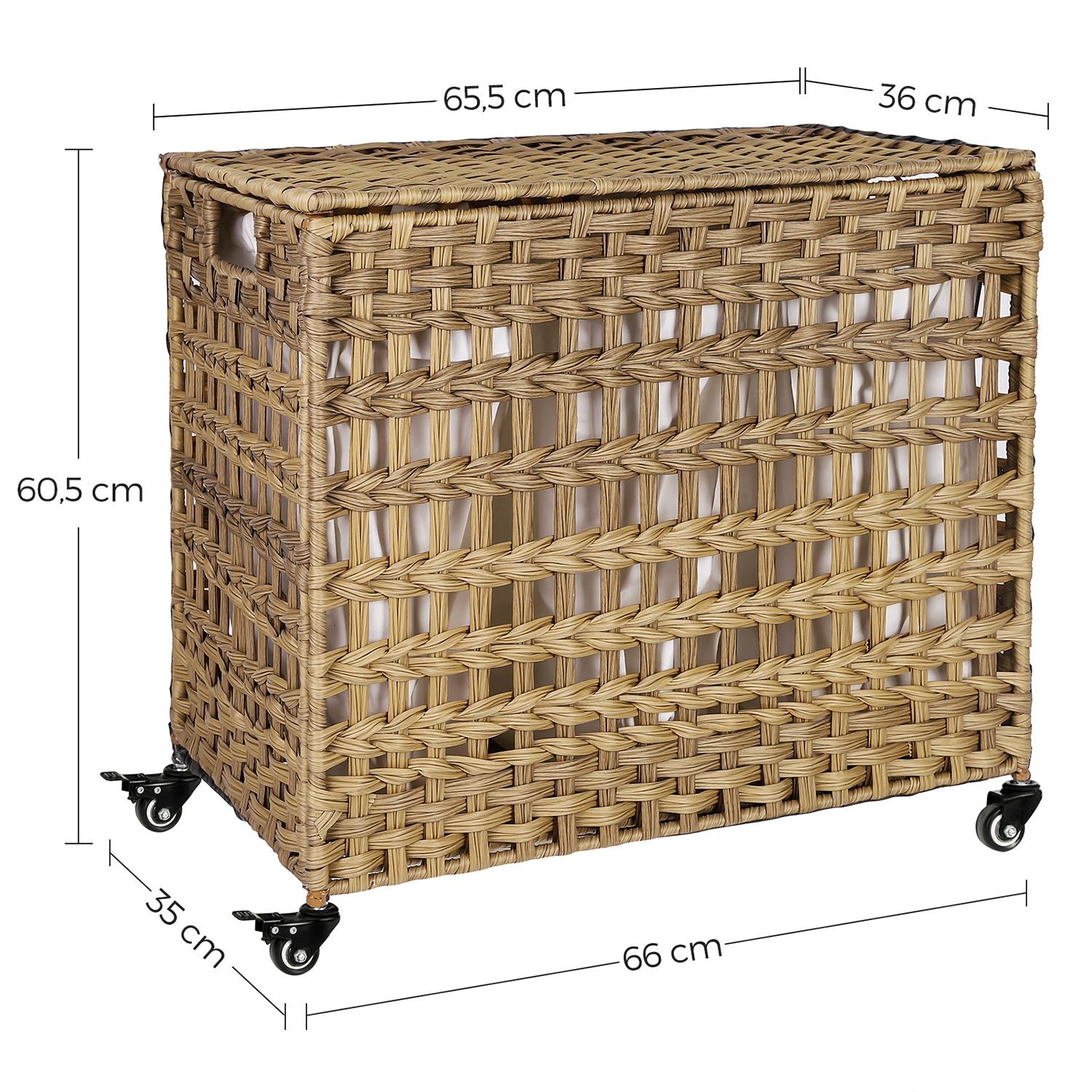 Håndvævet vasketøjskurv med låg, vasketøjskurv i rotting-stil med 3 separate rum, håndtag, aftagelige indersække,  naturfarvet