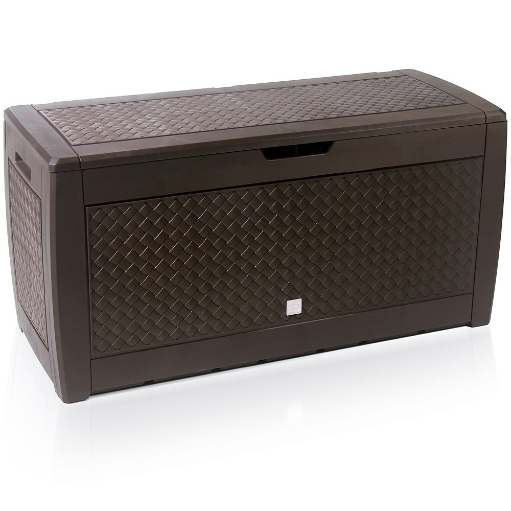 Den vejr- og UV-bestandige opbevaringsboks med en volumen på 310 liter giver tilstrækkelig plads. Den har hjul til nem bevægelse og tre håndtag og er ligetil at samle.