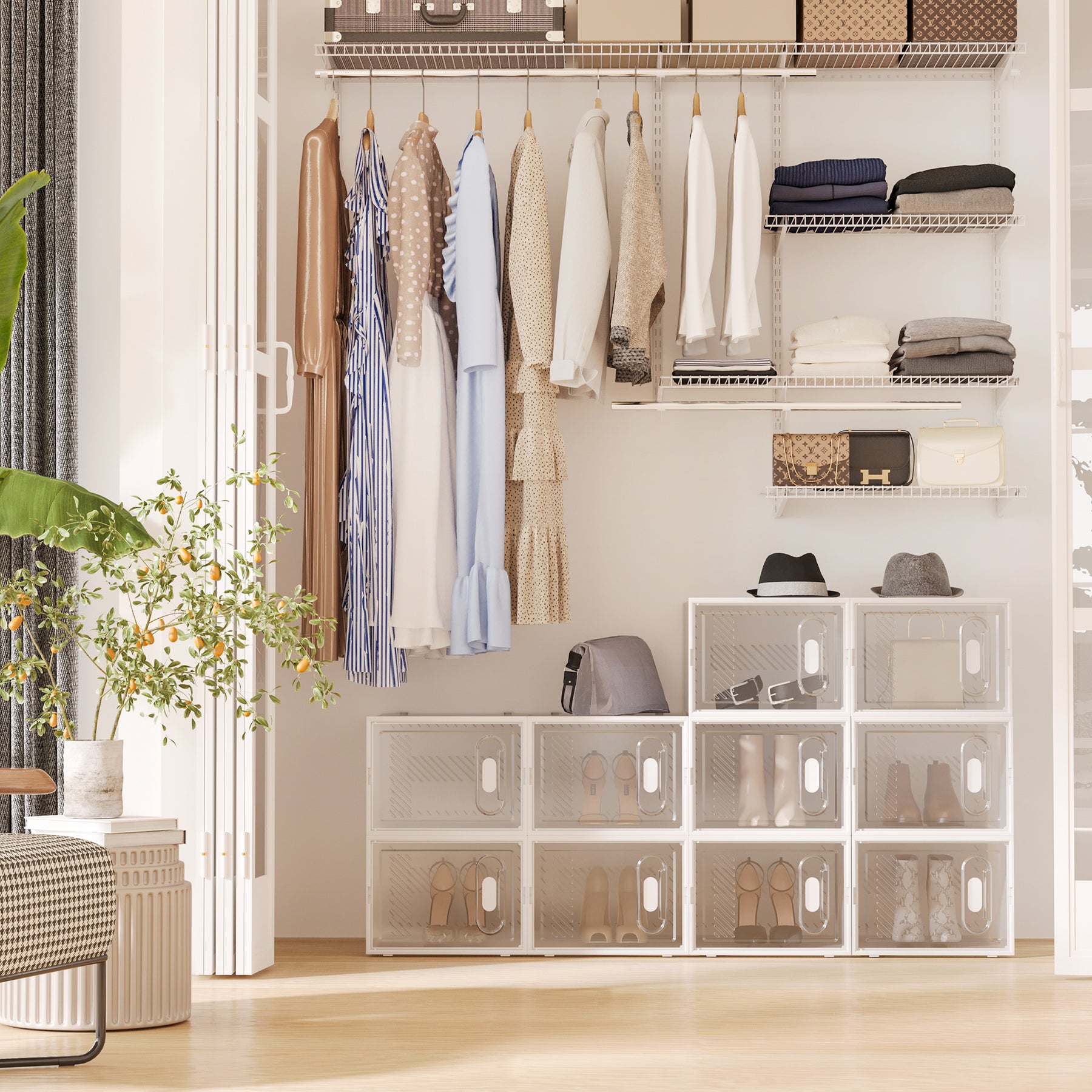 Hold dine sko organiseret og fri for støv med denne smarte og fleksible skoreol, der tilbyder 18 rummelige opbevaringspladser. Det gennemsigtige design gør det nemt at finde det, du leder efter, samtidig med at den modulære konstruktion giver mulighed for at stable enhederne, så de passer ind i selv de mindste rum.