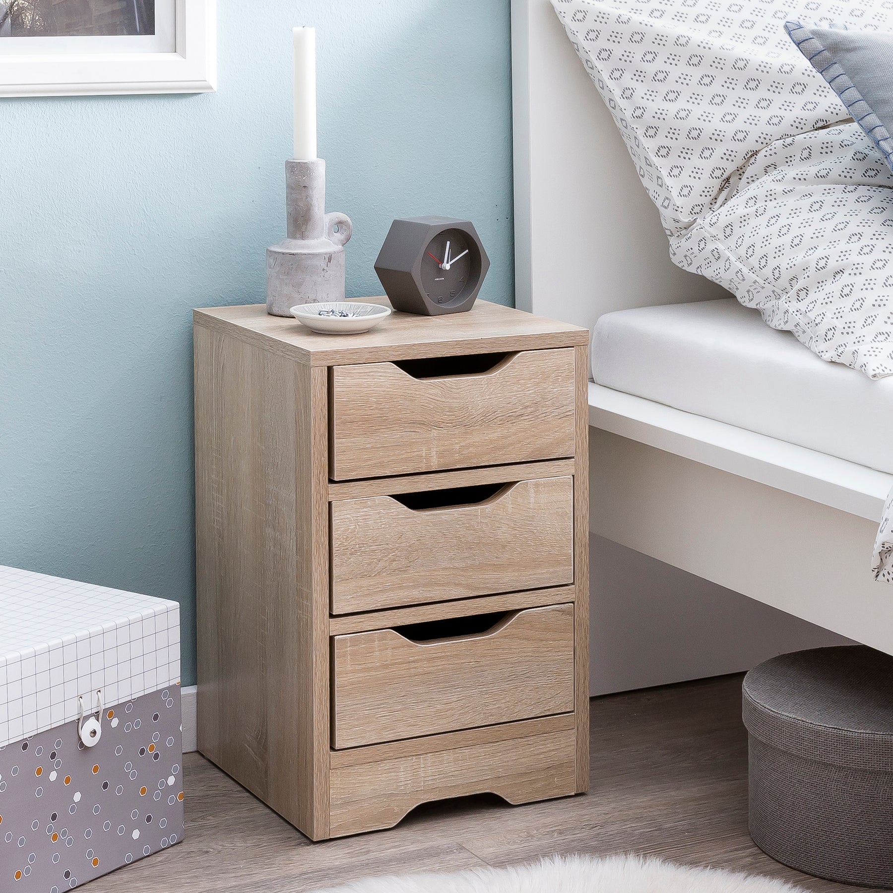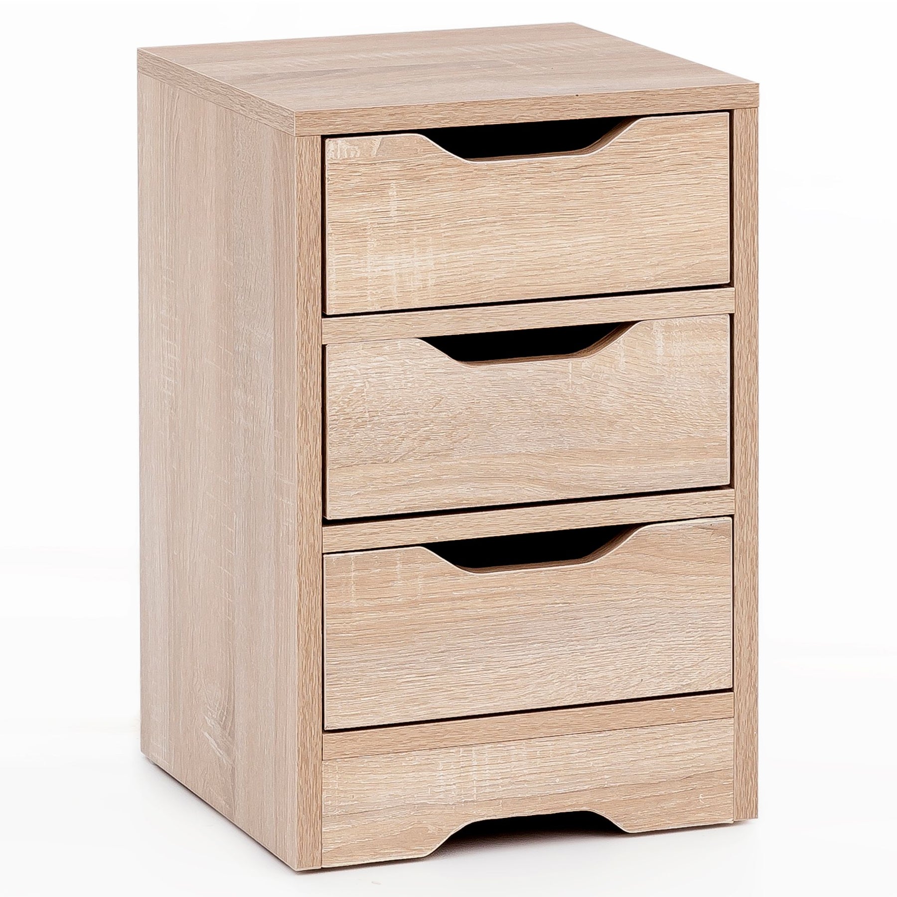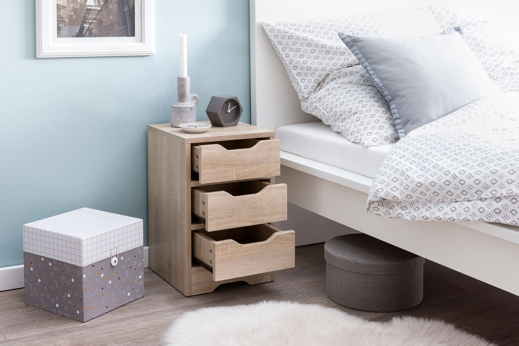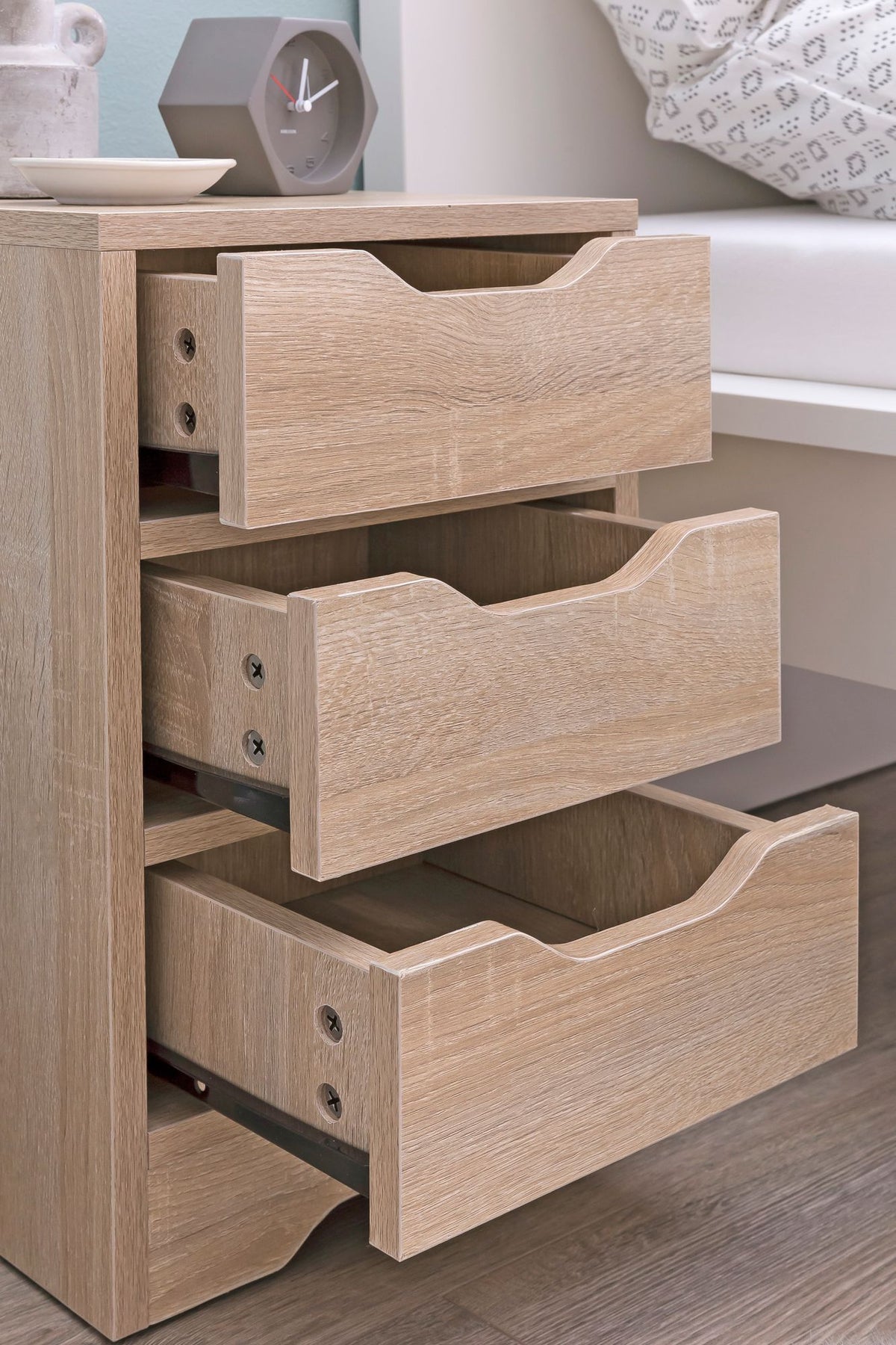 Stor hylde til sengelampe og andre genstande. Skuffer kan trækkes fuldt ud. Materiale: Komplet natbord: Presset spånplade (melaminbelagt). Information om melaminharpiksbelægningen: Melaminharpiks er på grund af sine egenskaber et ideelt materiale til belægning af møbler. Det danner ekstremt hårde og ridsefaste overflader og er også vandafvisende og fedtafvisende. Plejeanvisning: Tør af med en fugtig klud, eventuelt med et mildt rengøringsmiddel, og tør derefter af med en tør klud. Brug ikke skrappe eller opløsningsmiddelbaserede rengøringsmidler.