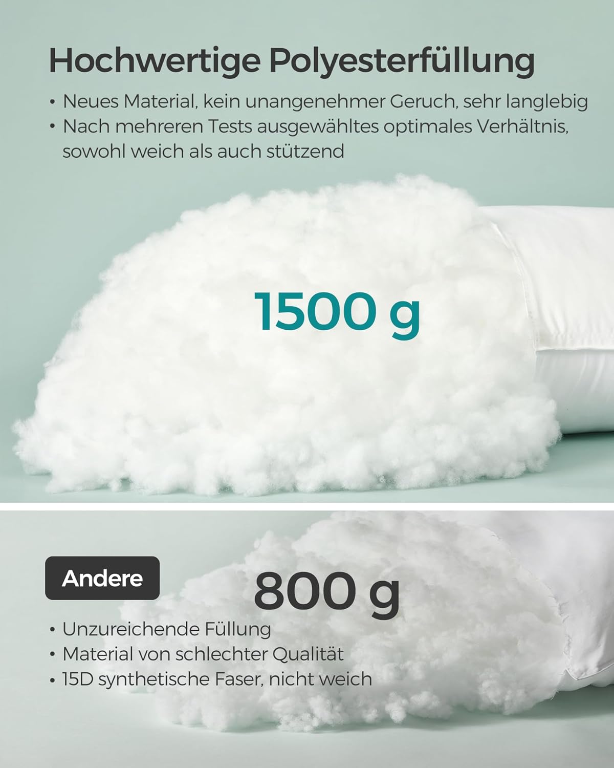 Puden er fyldt med en optimal blanding af 65% luftige 3D-polyesterfibre og 35% faste 7D-polyesterfibre, der er testet grundigt for at sikre den rette balance. Med en fyldning på 1500 g vågner du op fuld af energi hver morgen.