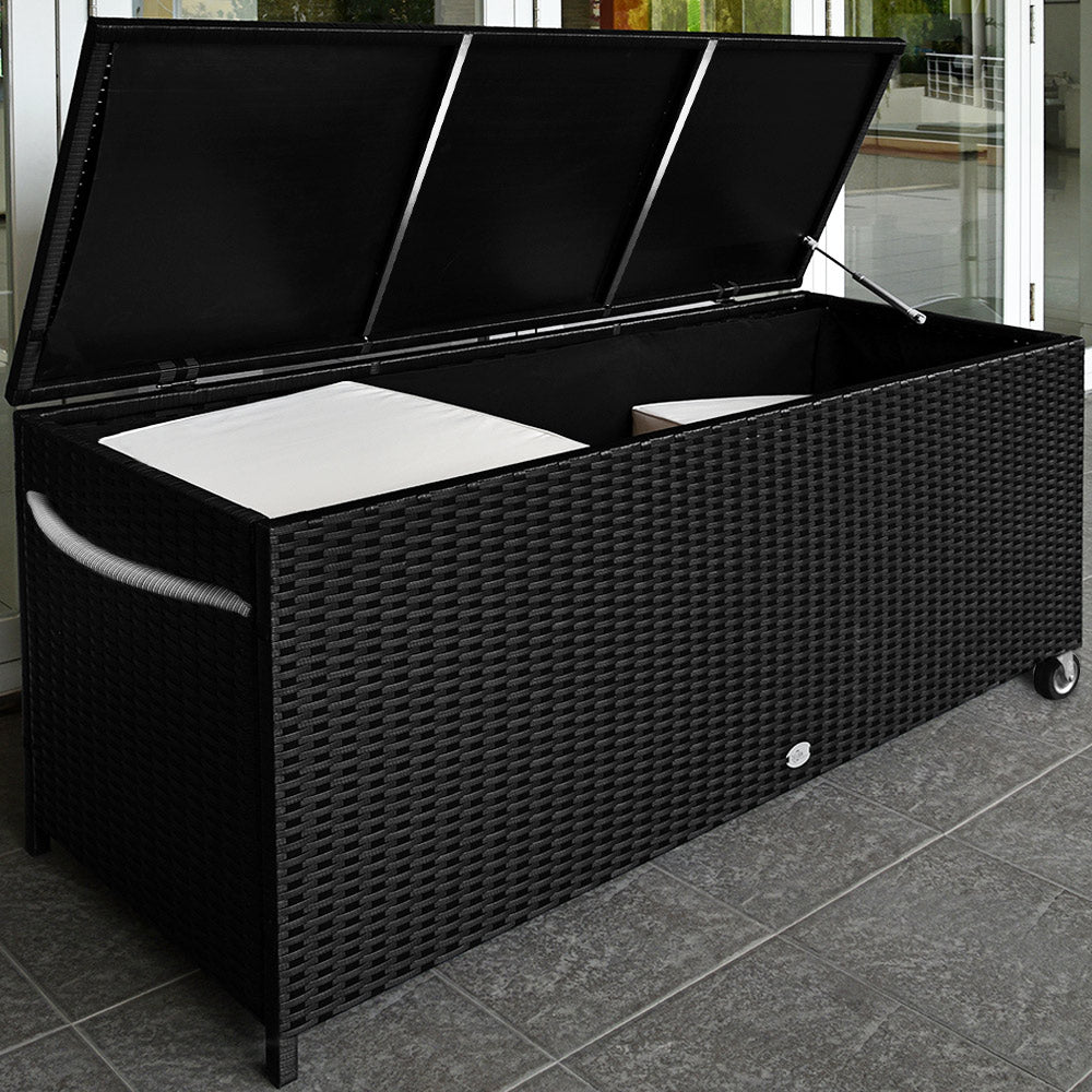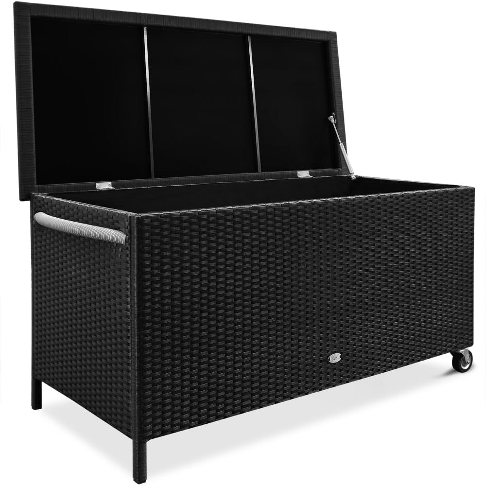 Polyrattan: Vores opbevaringsboks er lavet af polyrattan. Materialet er kendetegnet ved dets holdbarhed og er robust. Derudover er polyrattan UV-bestandig, hvilket betyder, at materialets naturlige farve bevares i lang tid.