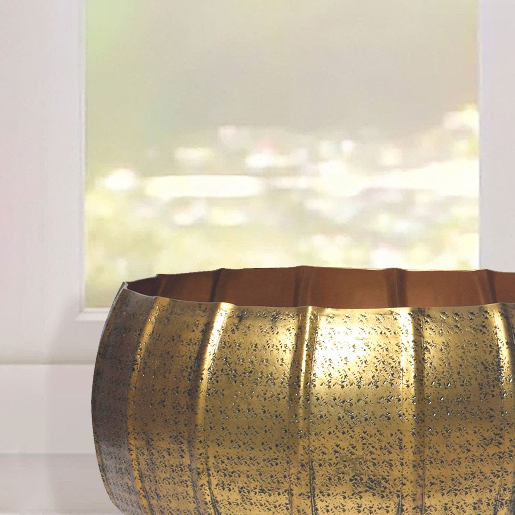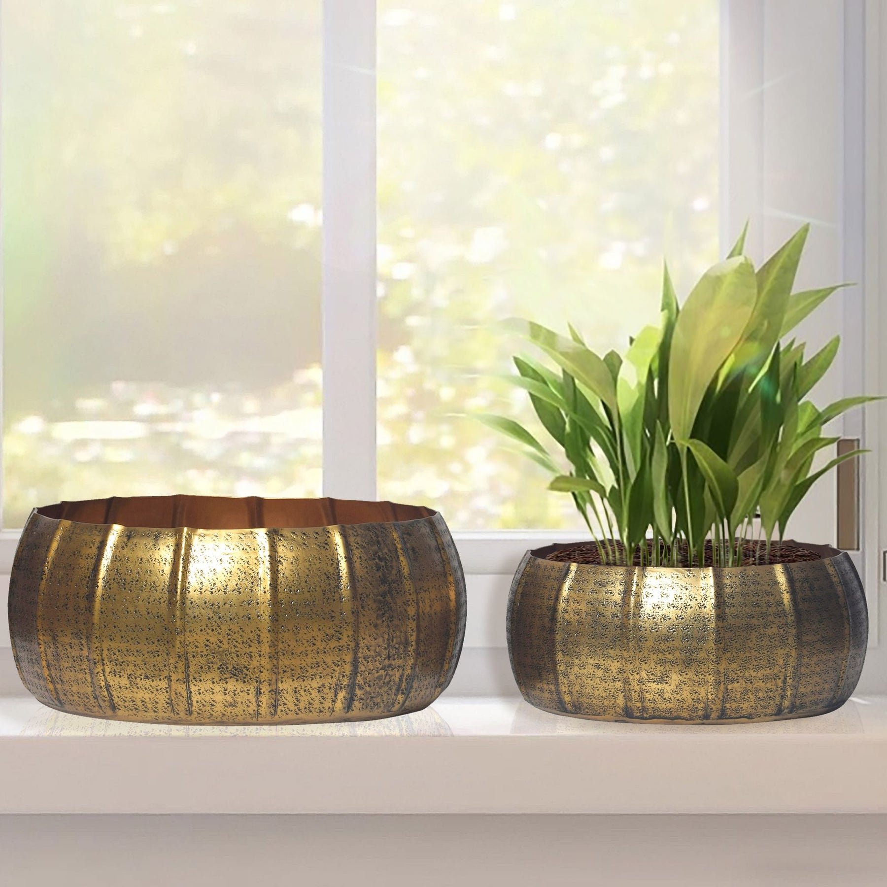 Sæt med 2 metalplantekasser, gulddesign, runde aluminiums indendørsplantekasser, 2-delt hamret blomsterpotte/skålsæt