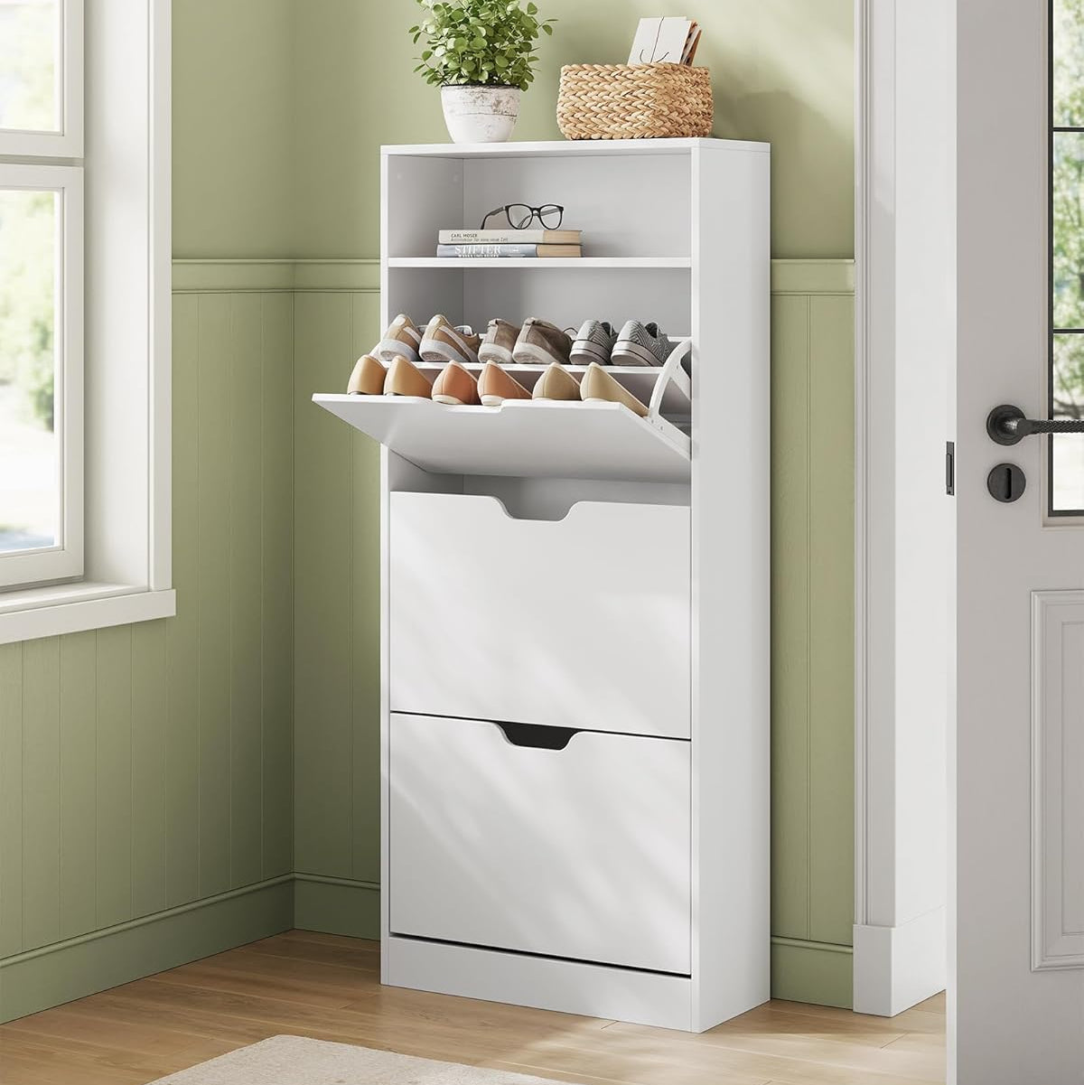 Skoskab med 3 hængslede døre, skoholder, åbent rum, justerbar skillevæg, plads til 14 til 18 par sko, til lille entré, 24 x 60 x 139 cm, hvid