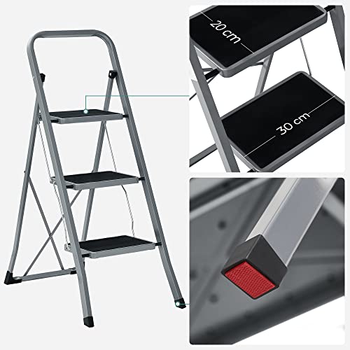 Sikkerhed først: Stigen låser automatisk ved fuld udfoldelse for at undgå uheld. De 20 cm brede trin er belagt med gummi med struktur, og de 4 ben har skridsikre fødder.